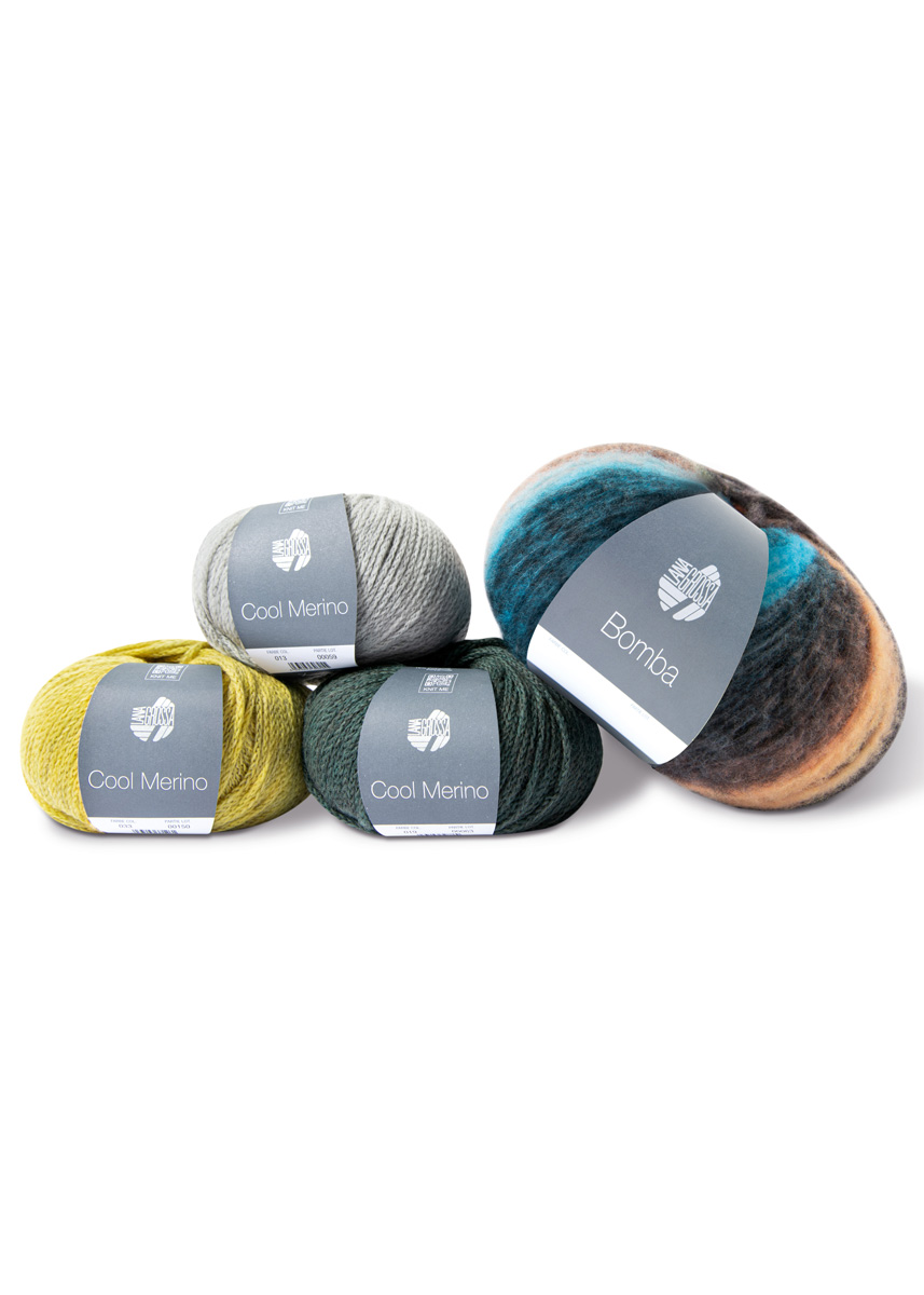 Fil Lana Grossa, « Bomba » (85 % laine mérinos extrafine), 15 % polyamide, 290 m/100 g) : 100 g (1 pelote) couleur 7 (pêche/blanc/vert clair/foncé/gris pétrole/marron/bleu turquoise) ; « Cool Merino » (90 % laine mérinos), 10 % polyamide, 150 m/50 g) : 50 g de chaque couleur 19 (vert), 50 g de chaque couleur 33 (jaune) et 50 g de chaque couleur 13 (gris clair).