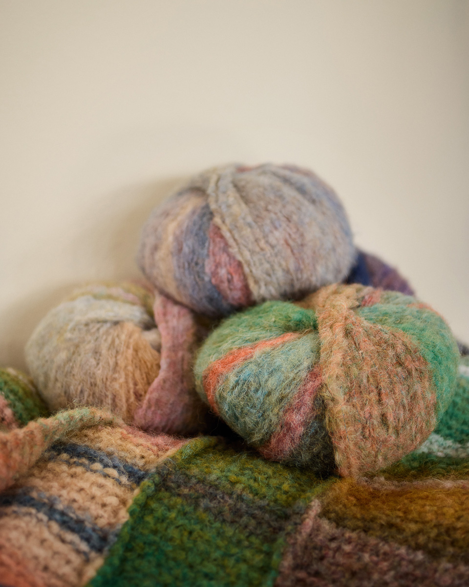 Fil d'alpaga volumineux avec structure à effet dans un mélange rayé coloré.