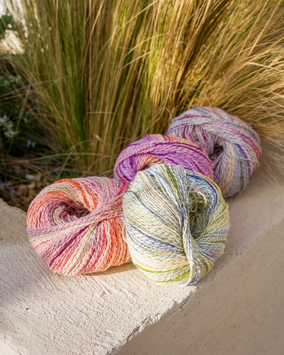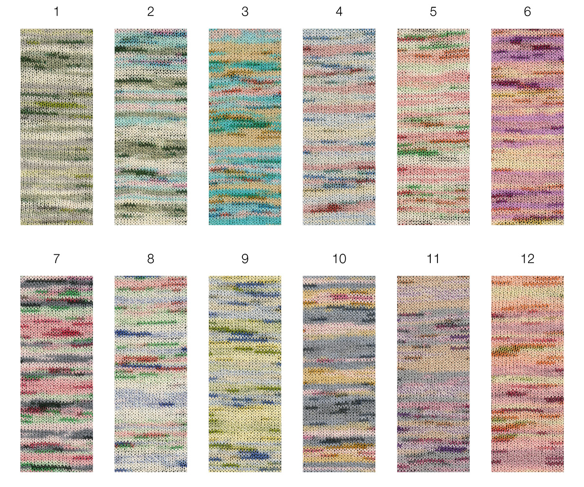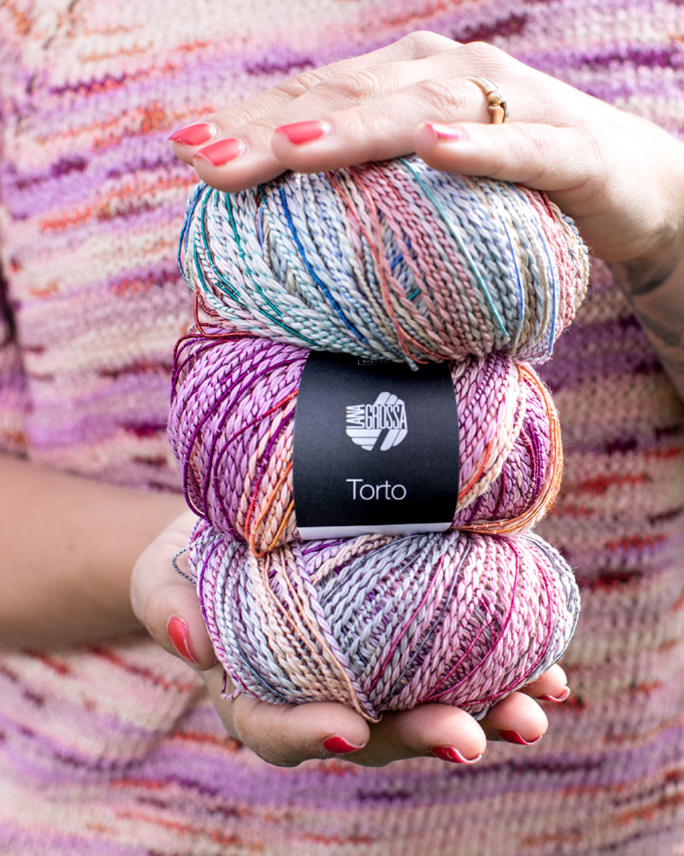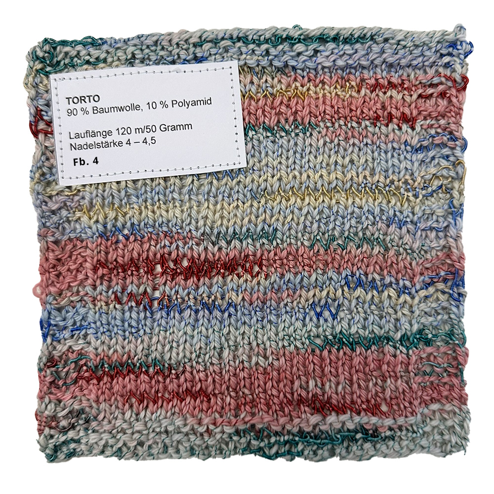 Torto est un fil créatif en coton avec un double effet de couleur captivant : le fil de base présente un dégradé de teintes Mélange doux, tandis qu'il est enroulé irrégulièrement avec un fin fil brillant. Cela crée un échantillon de mailles vivant, structuré, avec une lueur subtile et une profondeur naturelle.
