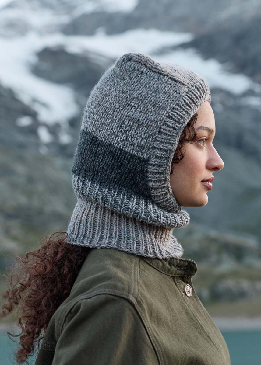 Lana Grossa qualité «Gomitolo Fumo» (50% laine vierge, 50% polyacrylique, long. de fil = env. 700 m/ 200 g) : 1 pelote = env. 200 g en gris pâle/gris clair/gris moyen/ gris foncé/grège/anthracite (col. 518) ; aig. circ. courte ou jeu d´aig. n° 5.
