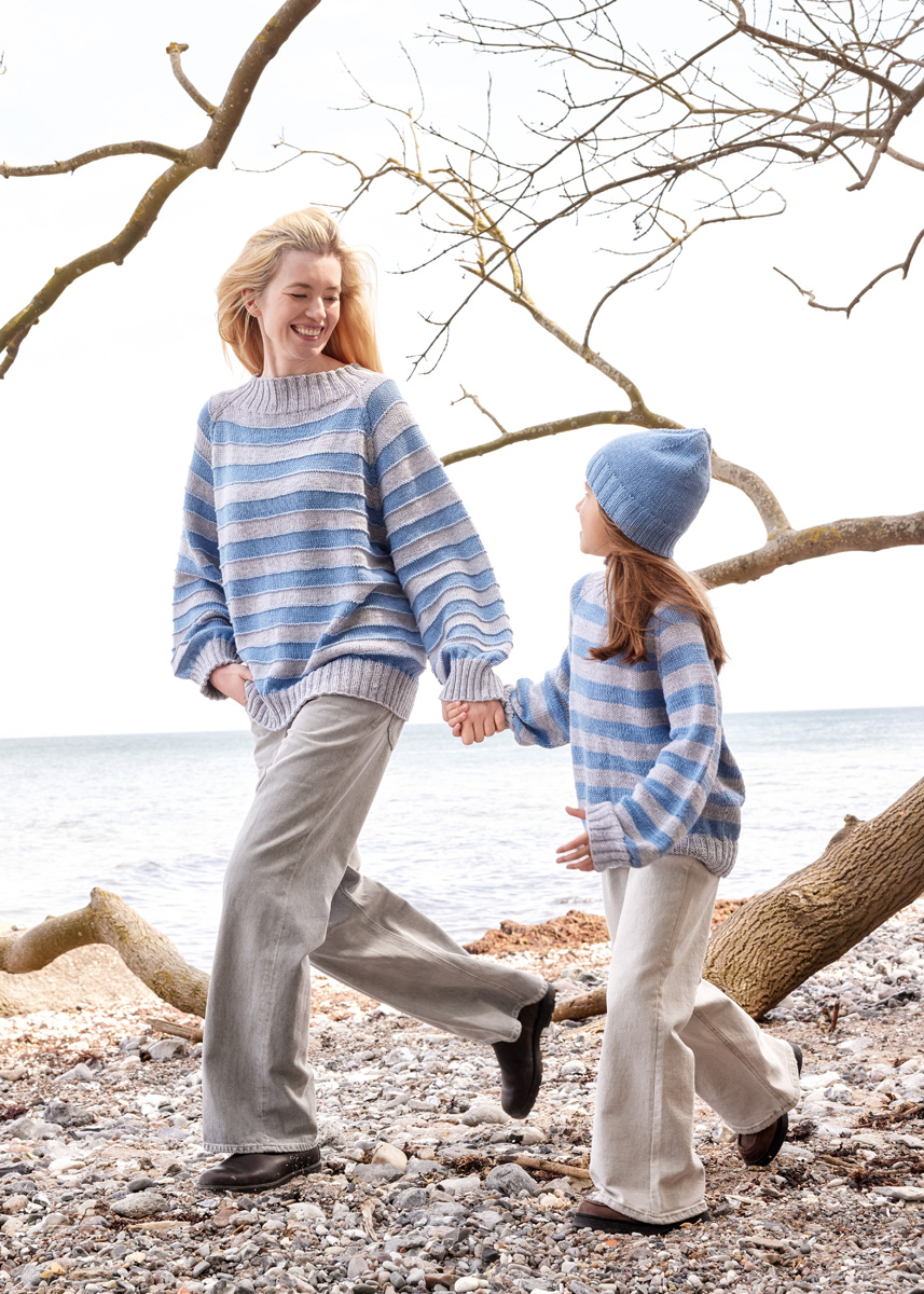 Lana Grossa Cool Wool Big Mélange (100% laine vierge (mérinos extrafine), long. de fil 120 m/50 g), 50 (50 - 100) g en bleu clair chiné (col. 1620). 5 aig. (= jeu d´aig.) n° 3,5 et 4. Six AM. Motif côtelé : alt. 2 m. end. et 2 m. env
