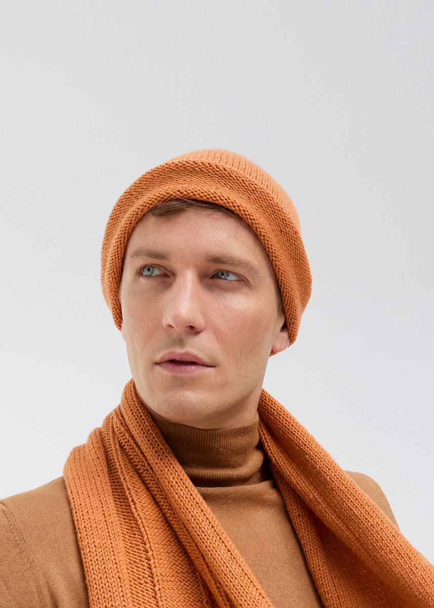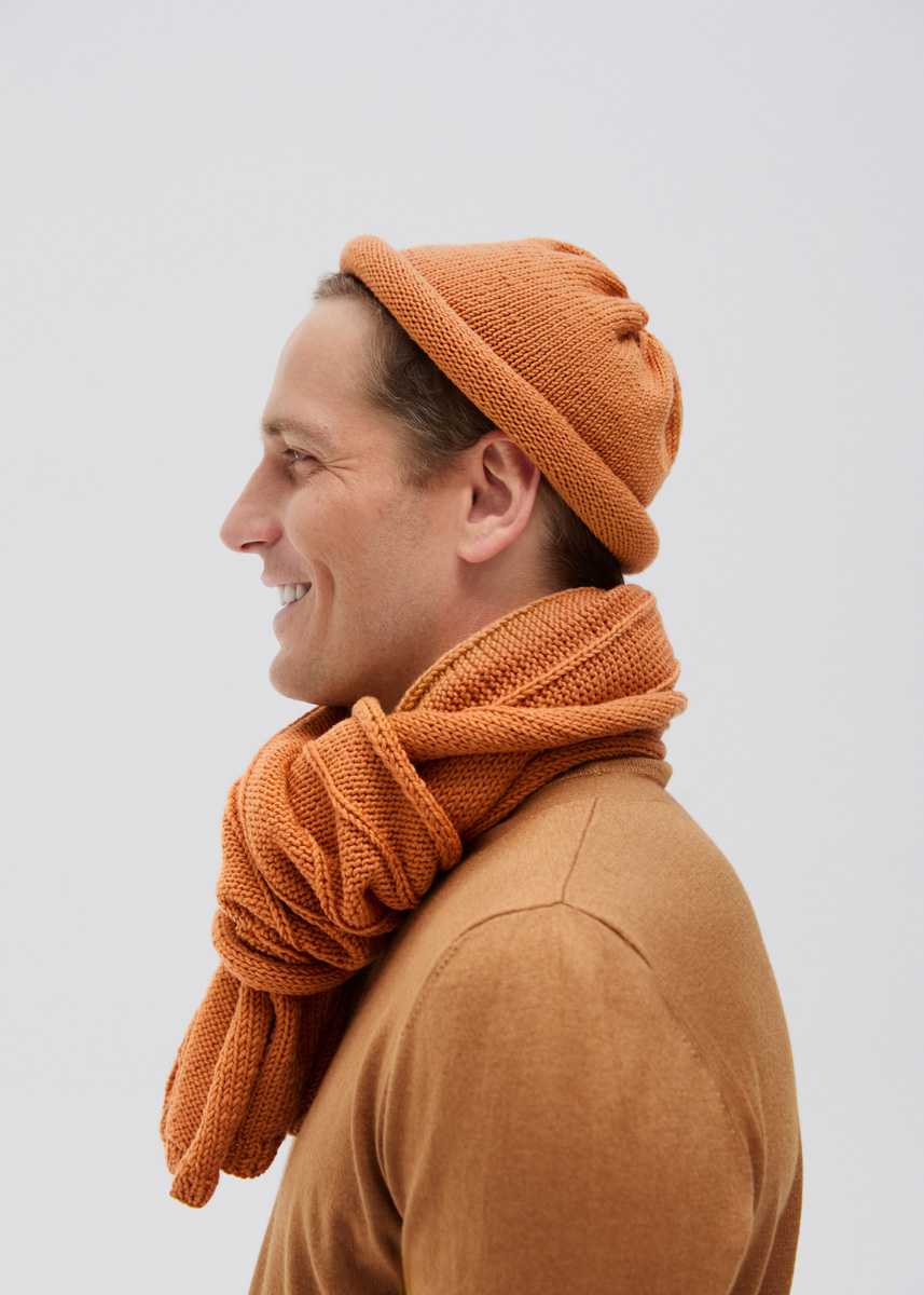 Lana Grossa «Cool Wool» (100% laine vierge (mérinos extra fine), long. de fil 160 m/50 g) : 100 g en brun orange (col. 2116) ; jeu d´aig. n° 3,5.