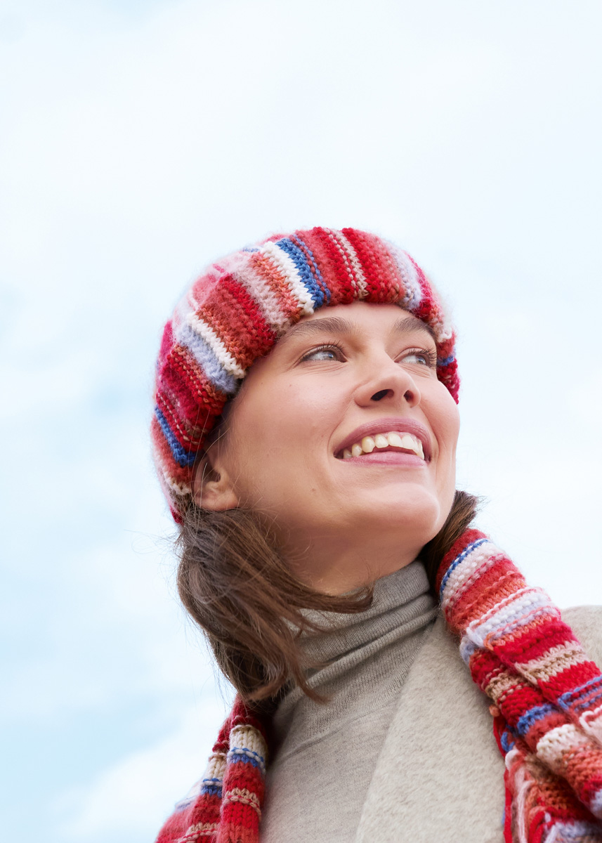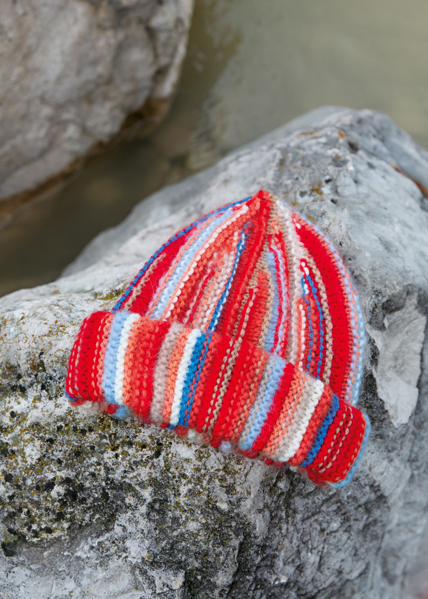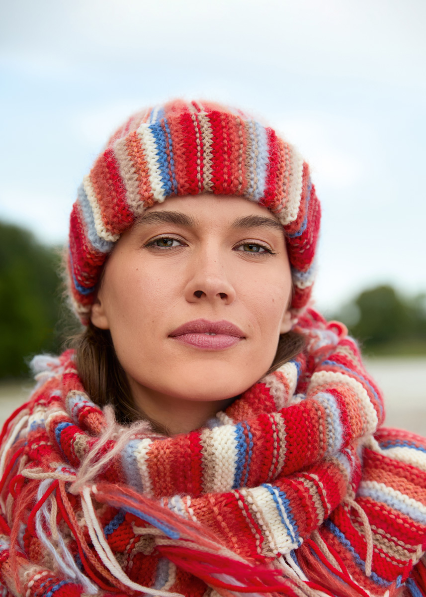 Lana Grossa «Mohair di Gio» (55% mohair (superkid), 45% laine vierge (mérinos), long. de fil = 85 m / 50 g) : 50 g en rouge lie de vin (col. 5), en rouge orangé (col. 6), en beige (col. 8), en bleu pastel (col. 10) ; Lana Grossa «Cool Wool Superbig» (100% laine vierge (mérinos), long. de fil 80 m/50 g) : 50 g en rouge (col. 9) et en coquille d´oeuf (col. 35) ; Lana Grossa «Cool Merino» (90% laine vierge, 10% polyamide, long. de fil = 150 m/50 g) : 50 g en bleu (col. 24), en rouge saumoné (col. 36) et en beige (col. 40) ; aig. à tric. n° 5.