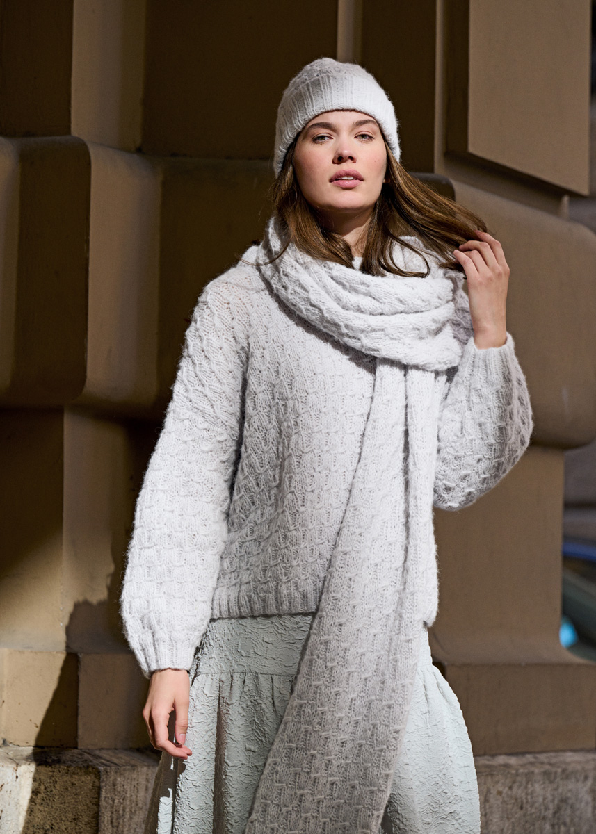 Lana Grossa qualité «Nebbia» (55 % laine vierge (mérinos extra fine), 45 % alpaga (baby), long. de fil = env. 170 m/50 g) : 50 g en gris blanc (col. 8) ; aig. circ. courte n° 5 et 5,5 ; jeu d´aig. n° 5,5.