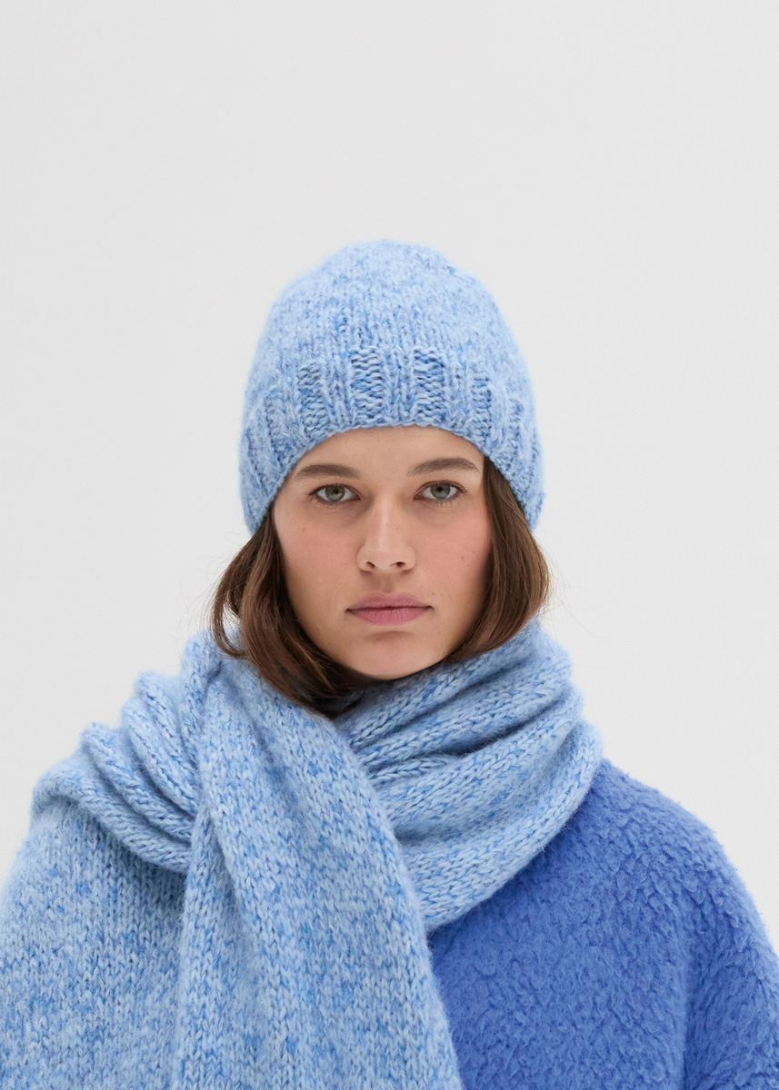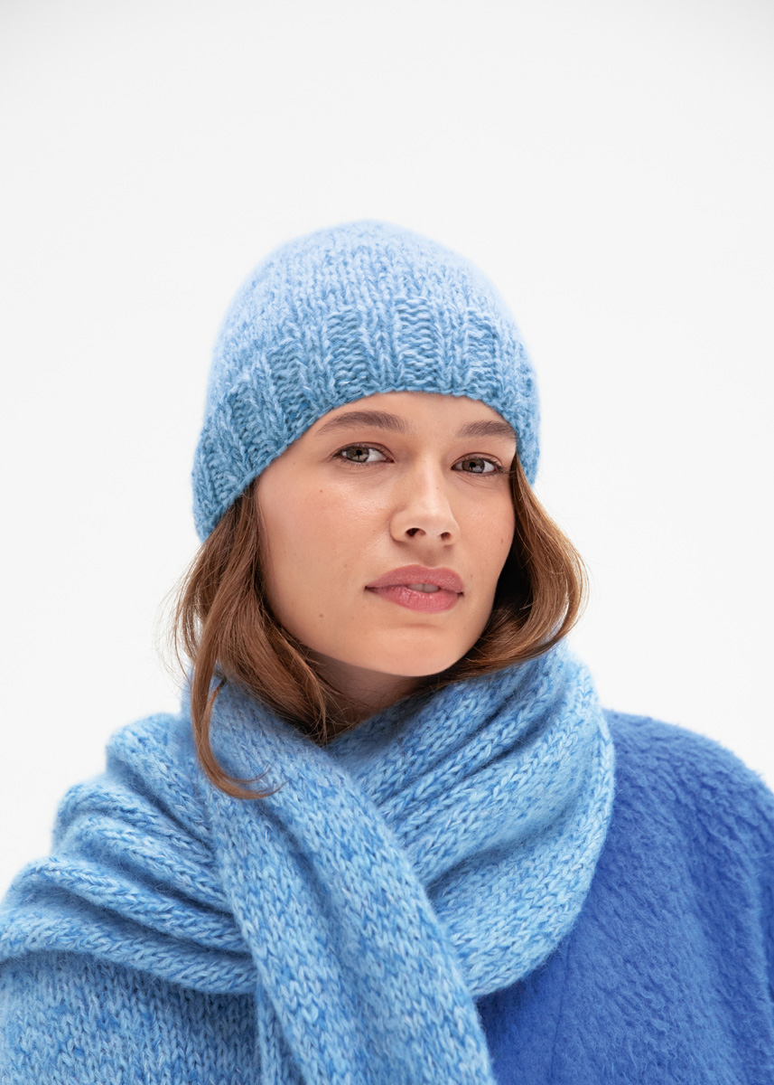 Lana Grossa «Nebbia» (55% laine vierge (mérinos ultrafine), 45% (baby) alpaga, long. de fil = 170 m/50 g): 50 g bleu clair (col. 6) et Lana Grossa «Setasuri» (69% alpaga (suri), 31% soie, long. de fil = 212 m/25 g): resp. 25 g bleu clair (col. 14) et bleuet (col. 37); jeu d’aiguilles n° 6.