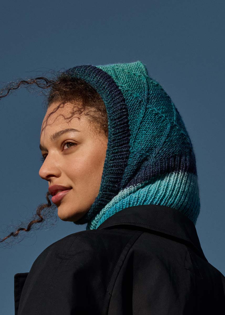 Lana Grossa qualité «Gomitolo Fumo» (50% laine vierge, 50% polyacrylique, long. de fil = env. 700 m/ 200 g) : 1 pelote = env. 200 g en vert menthe/turquoise/vert maritime/pétrole clair/pétrole foncé/anthracite (col. 511) ; aig. circ. courte ou jeu d´aig. n° 4,5.