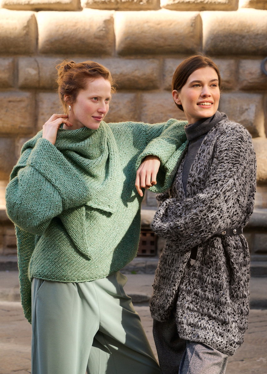 Lana Grossa qualité «Alta Moda Alpaca» (90% (baby) alpaga, 5% laine vierge (mérinos, 5% polyamide, long. de fil = env. 140 m/50 g) : env. 400 (450 - 500 - 550) g en gris clair chiné (col. 12) ; Lana Grossa qualité «Setasuri» (69 % alpaga (Suri), 31 % soie, long. de fil = env. 212 m/25 g) : env. 125 (150 - 150 - 175) g en anthracite (col. 18) ; Lana Grossa qualité «Cosmo» (100 % coton (plus paillettes), long. de fil = env. 260 m/100 g) : 200 (300 - 300 - 300) g en noir (col. 5) ; aig. à tric. n° 8 et 9 ; pour la ceinture, évent. 2 aig. à chaussette n° 6.