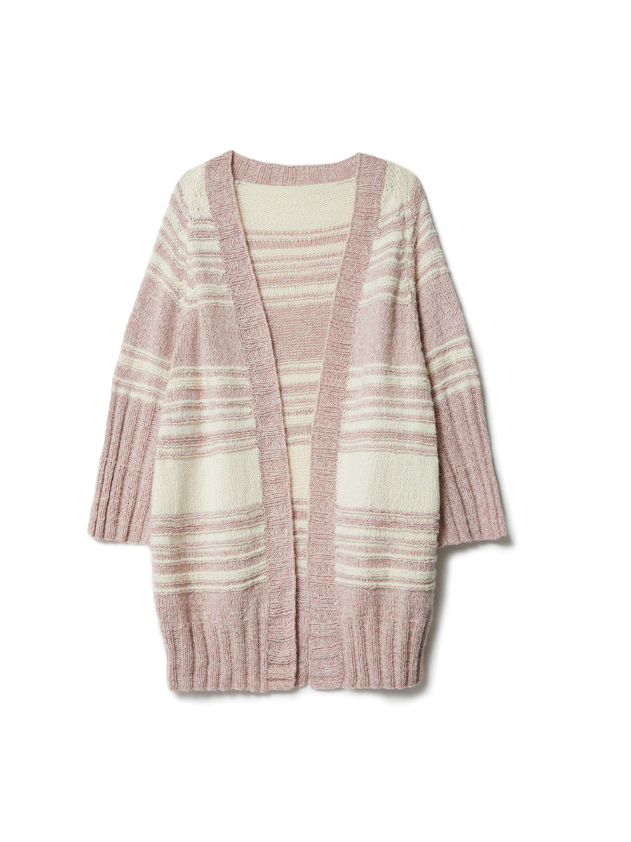 Lana Grossa «Alta Moda Cotolana» (45% laine vierge (mérinos), 45% coton (Pima), 10% polyamide, long. de fil env. 150 m/50 g), 250 (300 - 350 - 400) g en vieux rose (col. 7) et 100 (150 - 150 - 200) g Vanille (col. 20) et Lana Grossa qualité «Bella» (35 % coton, 30 % nylon, 25 % alpaga (baby), 10 % laine vierge (mérinos), long. de fil = env. 250 m/25 g), 75 (100 - 100 - 125) g en rose pâle (col. 3) et 25 (50 - 50 - 75) g en écru (col. 1) ; aig. à tric. n° 4 et 5, aig. circ. n° 5 de 120 cm de long.