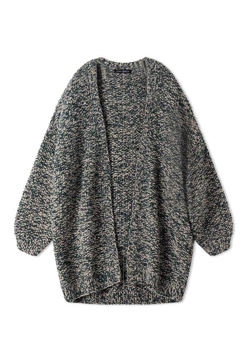 Lana Grossa qualité Brigitte No. 2 (47 % alpaga (bébé), 45 % coton, 8 % laine vierge (mérinos), LL = env. 140 m / 50 g), : 450 (500 - 550 - 600) g en beige clair (col. 47), 450 (500 - 550 - 600) g en vert noir (col. 73), aiguilles n° 5 et n° 6, 1 aiguille circulaire n° 5 de 120 cm.