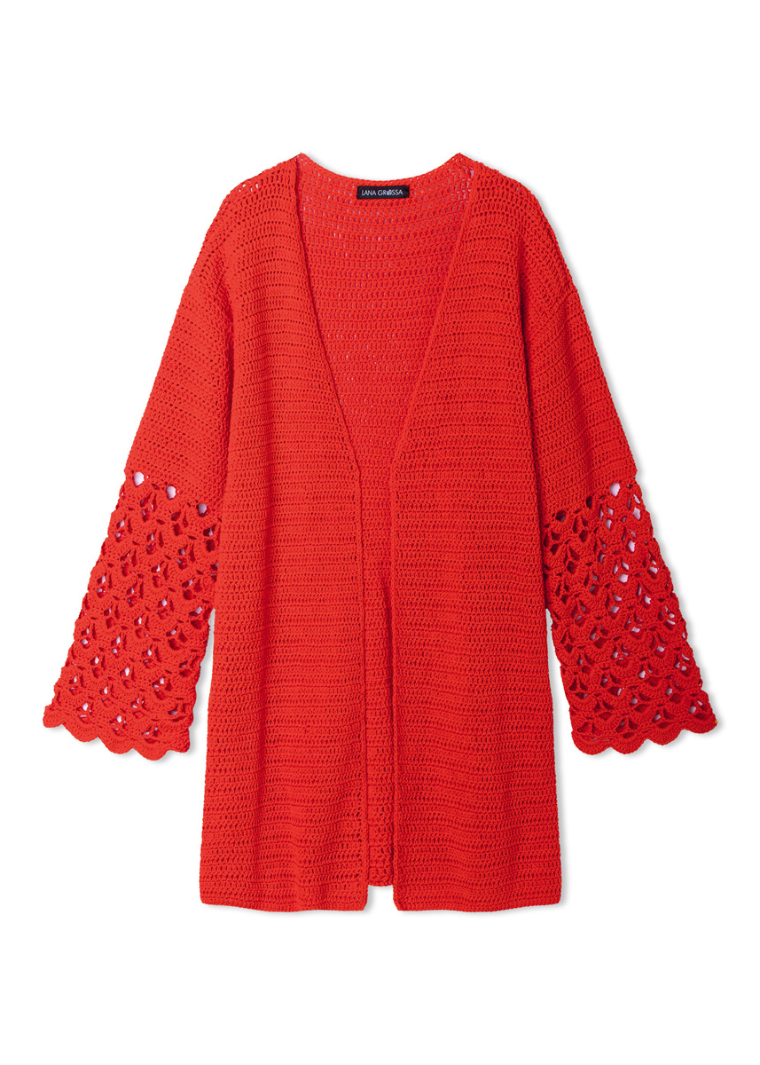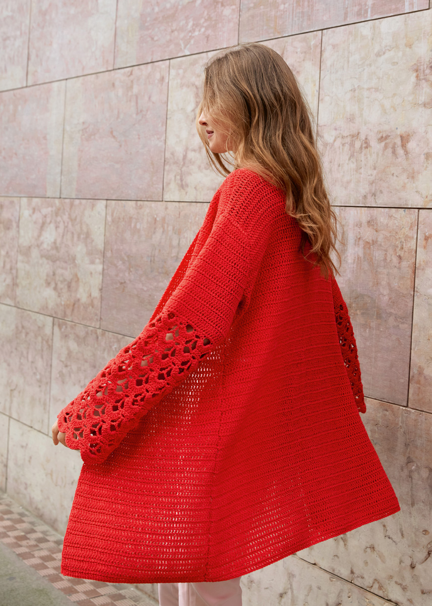 Lana Grossa « Gioia » (75 % coton, 25 % polyamide rec., long. de fil = env. 110 m/50 g) : env. 850 (900) g rouge (col. 8) ; 1 crochet pour laine n° 4.