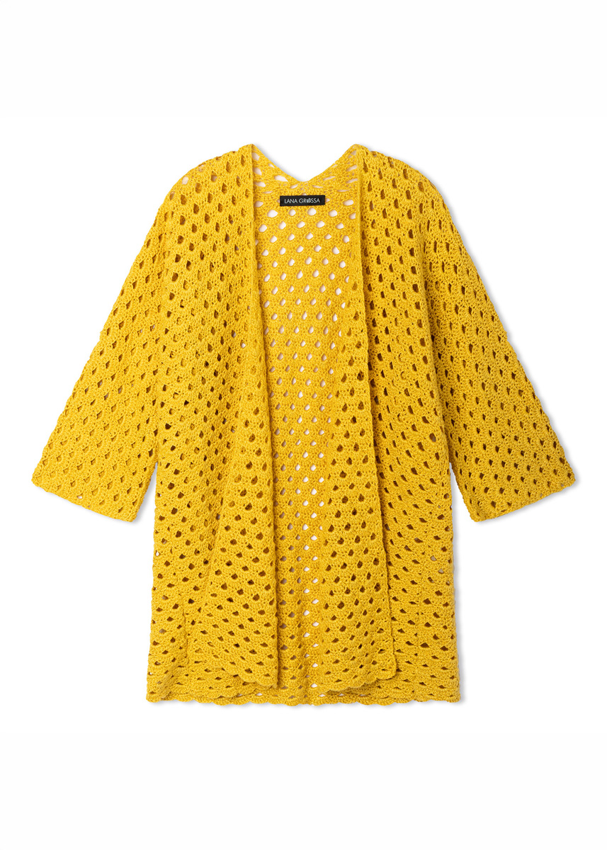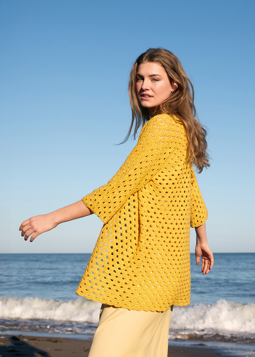 Lana Grossa « Linarte » (40 % viscose, 30 % coton, 20 % lin, 10 % polyamide, long. de fil = env. 125 m/50 g) : env. 750 (800-850) g jaune d’oeuf (col. 347) ; 1 crochet pour laine n° 4.