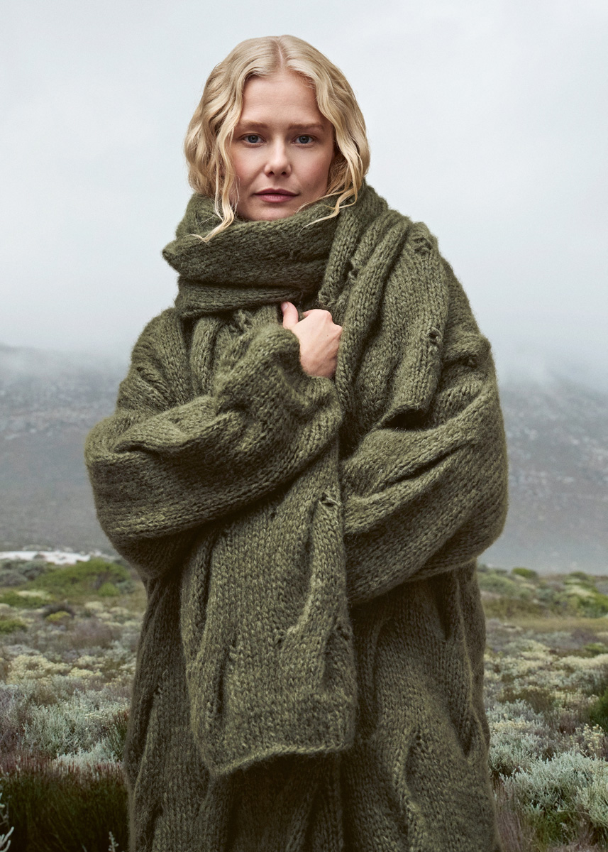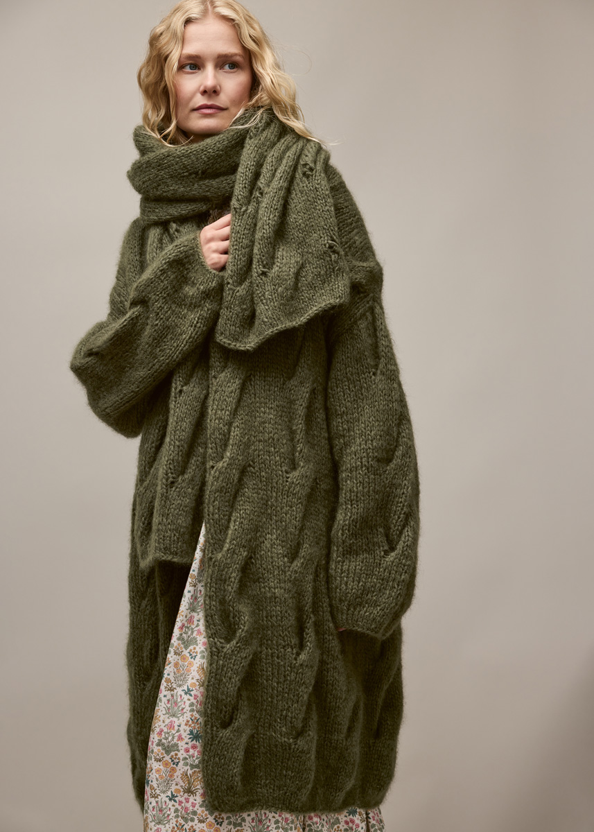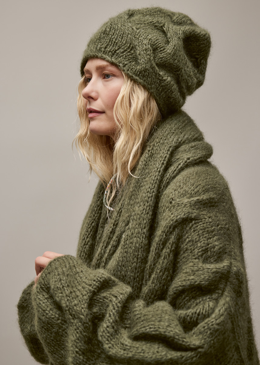 Lana Grossa «Mohair di Gio» (55% mohair (superkid), 45% laine vierge (mérinos), long. de fil = 85 m / 50 g) : 850 (900 / 950 / 1050) g en fougère (col. 14) ; aig. circ. de 6 et de 7 mm, 80 - 100 cm de long, une aig. circ. de 6 mm, 40 cm de long (ou tric. avec la méthode du Magic-Loop (page 64)), 1 aig. aux.