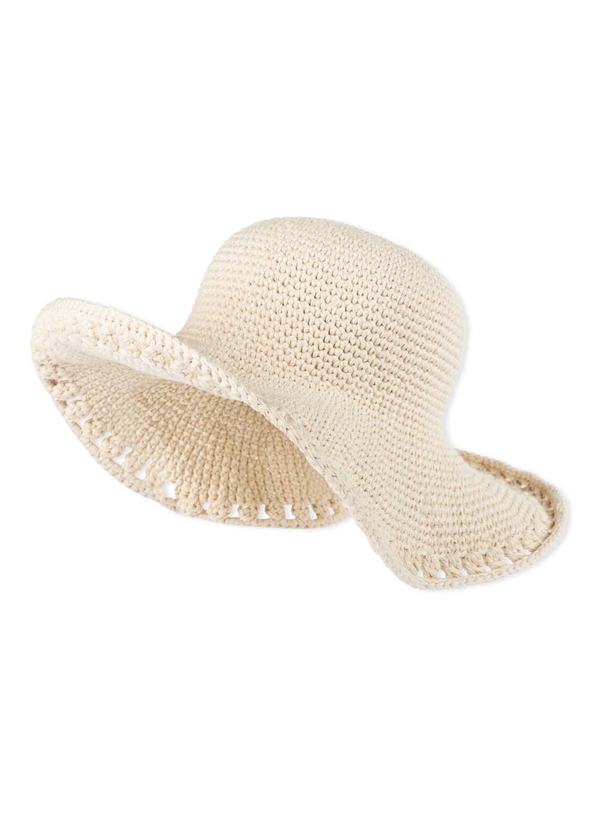Lana Grossa qualité „Natural Cotton” (100 % coton bio, longueur de fil = env. 80 m/50 g) : env. 200 g coquille d’oeuf (col. 18) ; 1 crochet à laine N° 4,5, 135 cm de fil synthétique pour chapeaux de 1,25 mm d’épaisseur avec raccord, en vente par exemple chez www.seidenversand.de