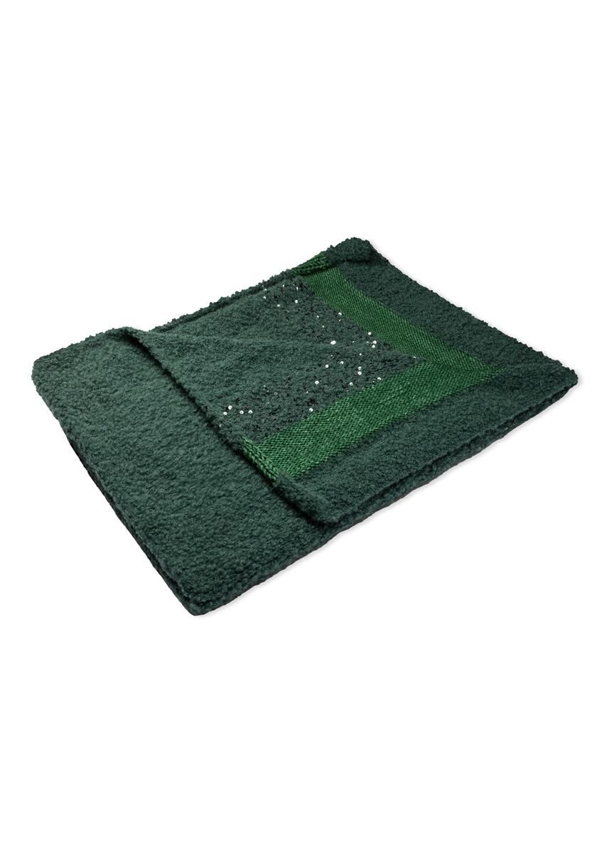 Lana Grossa qualité «Orsetto» (60 % laine vierge (mérinos), 40% alpaga (superfine), long. de fil env. 75 m./50 g) : env. 600 g en vert pétrole (col. 9), Lana Grossa «Vintage Superchunky » (100% laine vierge (mérinos extra fine), long. de fil 80 m/100 g) : env. 200 g en vert opale (col. 518) et Lana Grossa qualité «Cosmo» (100 % coton (plus paillettes), long. de fil = env. 260 m/100 g) : env. 100 g en gris (col. 3) ; aig. circ. n° 6, 120 cm de longueur.