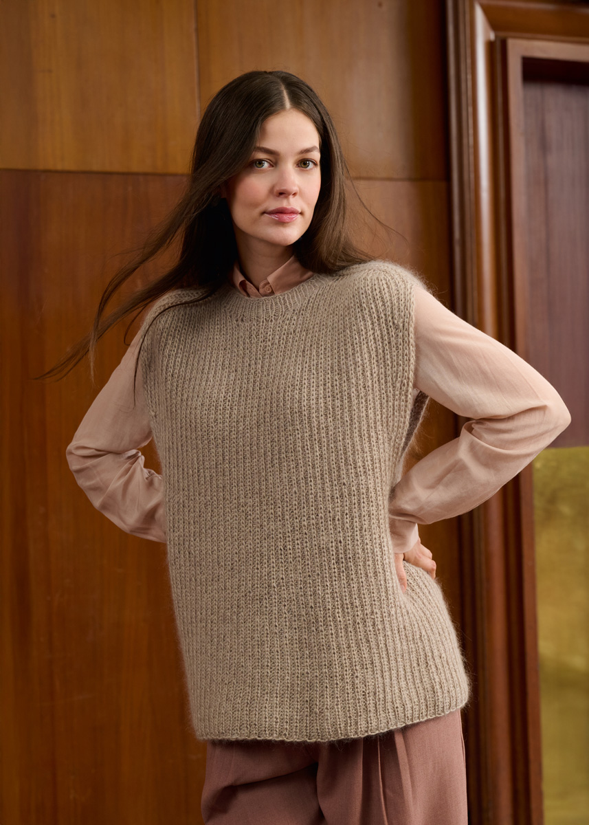 Lana Grossa qualité Ecopuno (72 % coton, 17 % laine vierge (mérinos), 11 % alpaga (bébé), LL = env. 215 m/50 g) : 250 (300 - 350 - 400) g en beige lin (col. 222) et Lana Grossa qualité Silkhair (70 % mohair (superkid), 30 % soie, LL = env. 210 m/25 g) : 125 (150 - 175 - 200) g en beige (col. 220) ; aiguille circulaire n° 4 de 40, 60 et 80 cm ; 4 marqueurs.