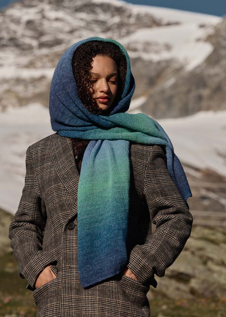Lana Grossa qualité «Gomitolo Versione» (60% laine vierge, 40% polyacrylique, long. de fil 700 m/200 g) : 1 pelote = env. 200 g en pétrole foncé/vert océan/vert d´eau/ bleu colombe (col. 456) ; aig. à tric. n° 5.