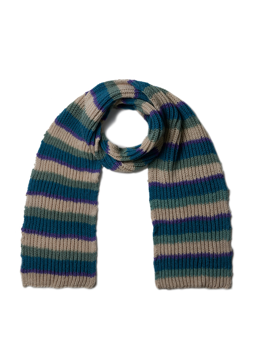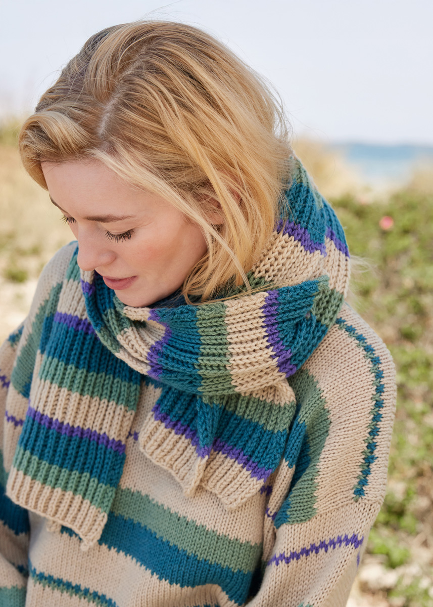 Lana Grossa Merino Uno (100% laine vierge (mérinos), long. de fil 125 m/50 g), 100 g en vert réséda (col. 34), 100 g en pétrole (col. 60), 100 g en grège (col. 55), 50 g en violet (col. 86). Aig. à tric. n° 6.