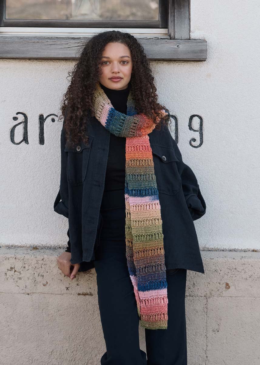 Lana Grossa qualité «Gomitolo Fumo» (50% laine vierge, 50% polyacrylique, long. de fil = env. 700 m/200 g) : 1 pelote = env. 200 g en rose pâle/abricot/orange/jaune/ gris vert/ocre/pétrole (col. 515) ; crochet n° 5.