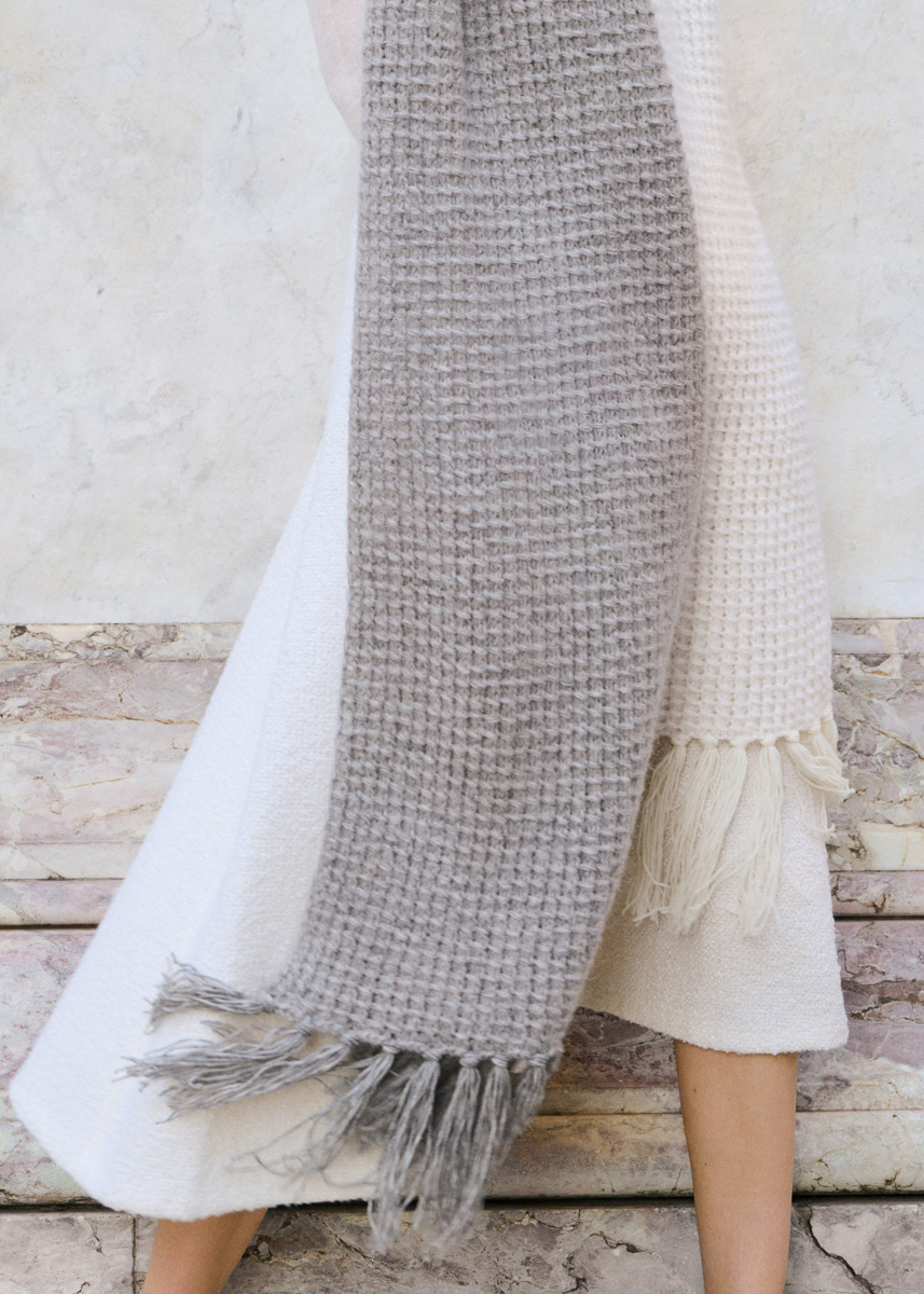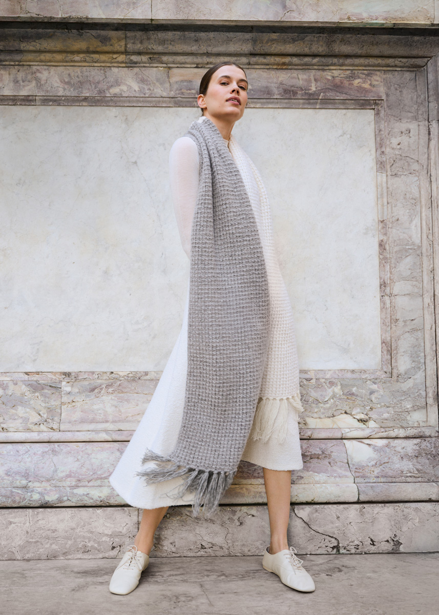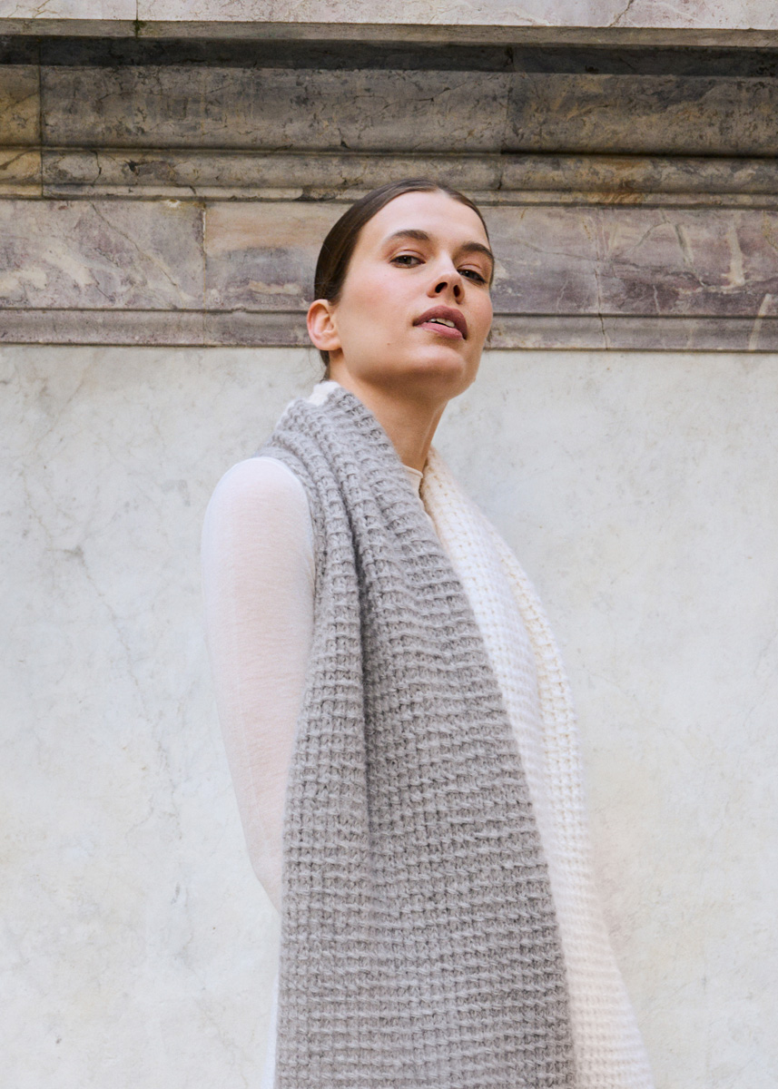 Lana Grossa qualité «Cashmere 16 Fine» (80% laine vierge (mérinos), 10% cachemire, 10% polyamide, long. de fil 320 m/50 g) : env. 100 g en écru (col. 9) et env. 100 g en gris clair (col. 15) ; Lana Grossa qualité «Setasuri» (69 % alpaga (Suri), 31 % soie, long. de fil = env. 212 m/25 g) : env. 125 g en blanc (col. 1) et env. 125 g en gris clair (col. 19) ; aig. à tric. n° 7 ; crochet n° 7.