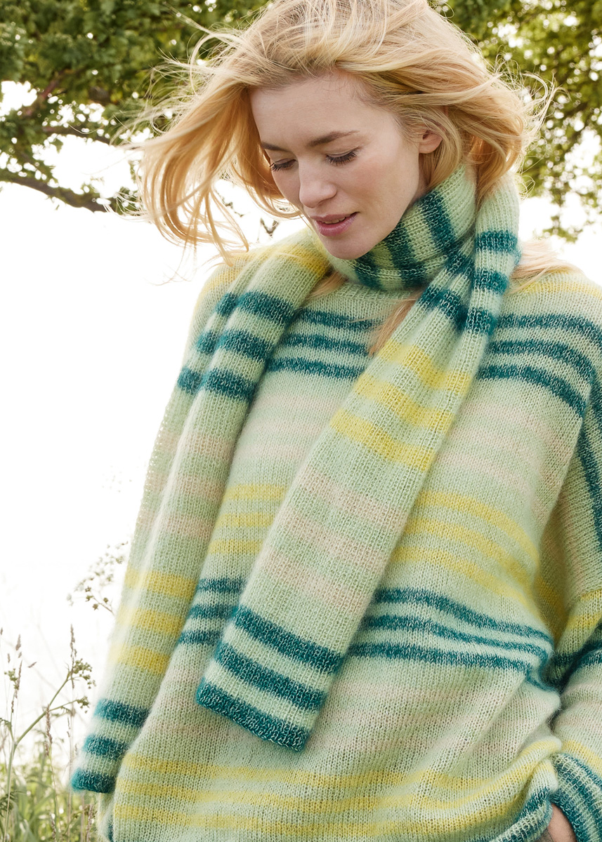 Lana Grossa Cool Wool Lace (100% laine vierge (mérinos extrafine), long. de fil 400 m/50 g), 100 g en vert pastel (col. 65), Lana Grossa Silkhair (70% mohair (superkid), 30% soie, long. de fil 210 m/25 g), 50 g en vert pâle (col. 211), 25 g en jaune narcisse (col. 217), vert sapin (col. 219) et beige poudré (col. 213), aig. à tric. n° 4.