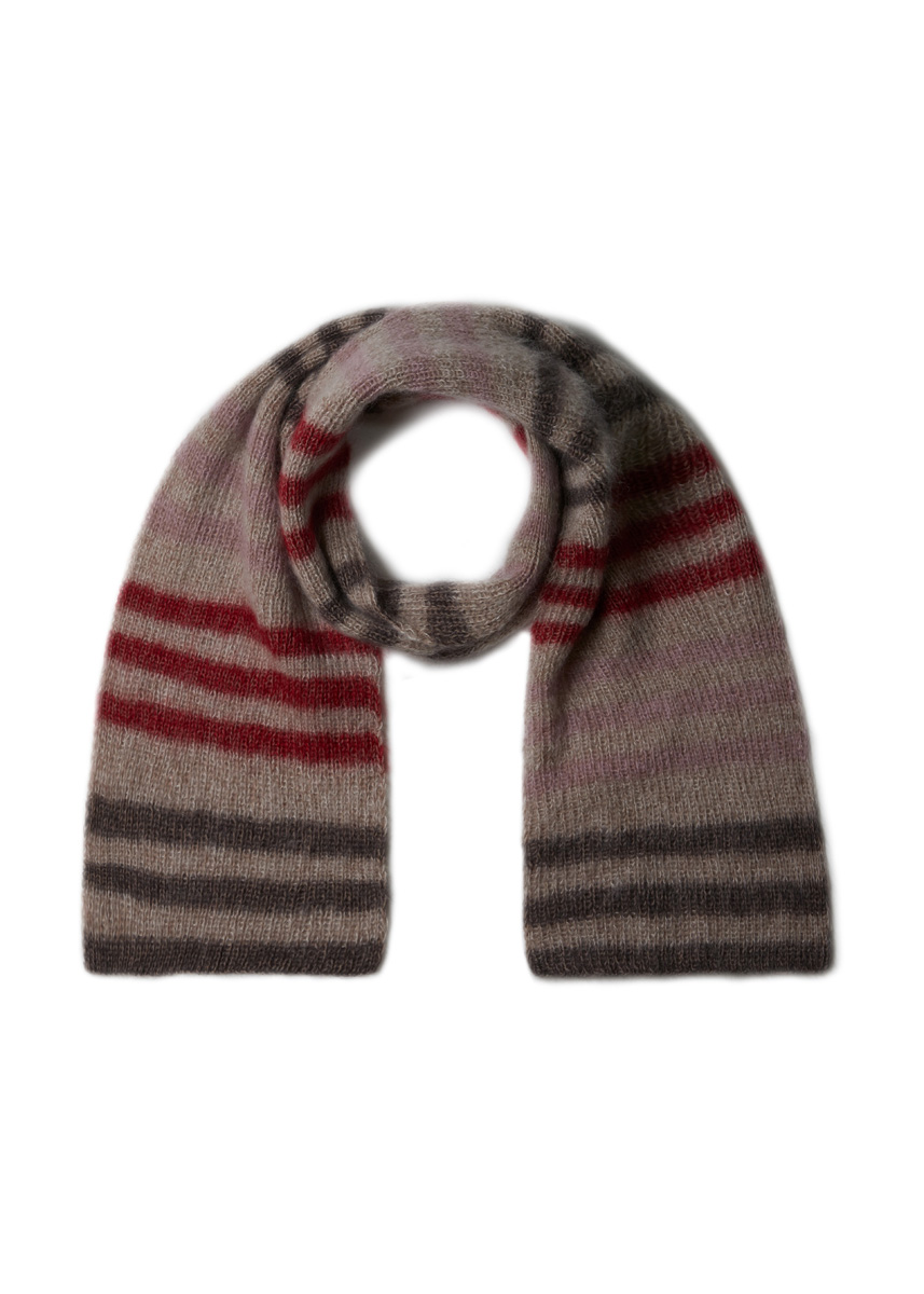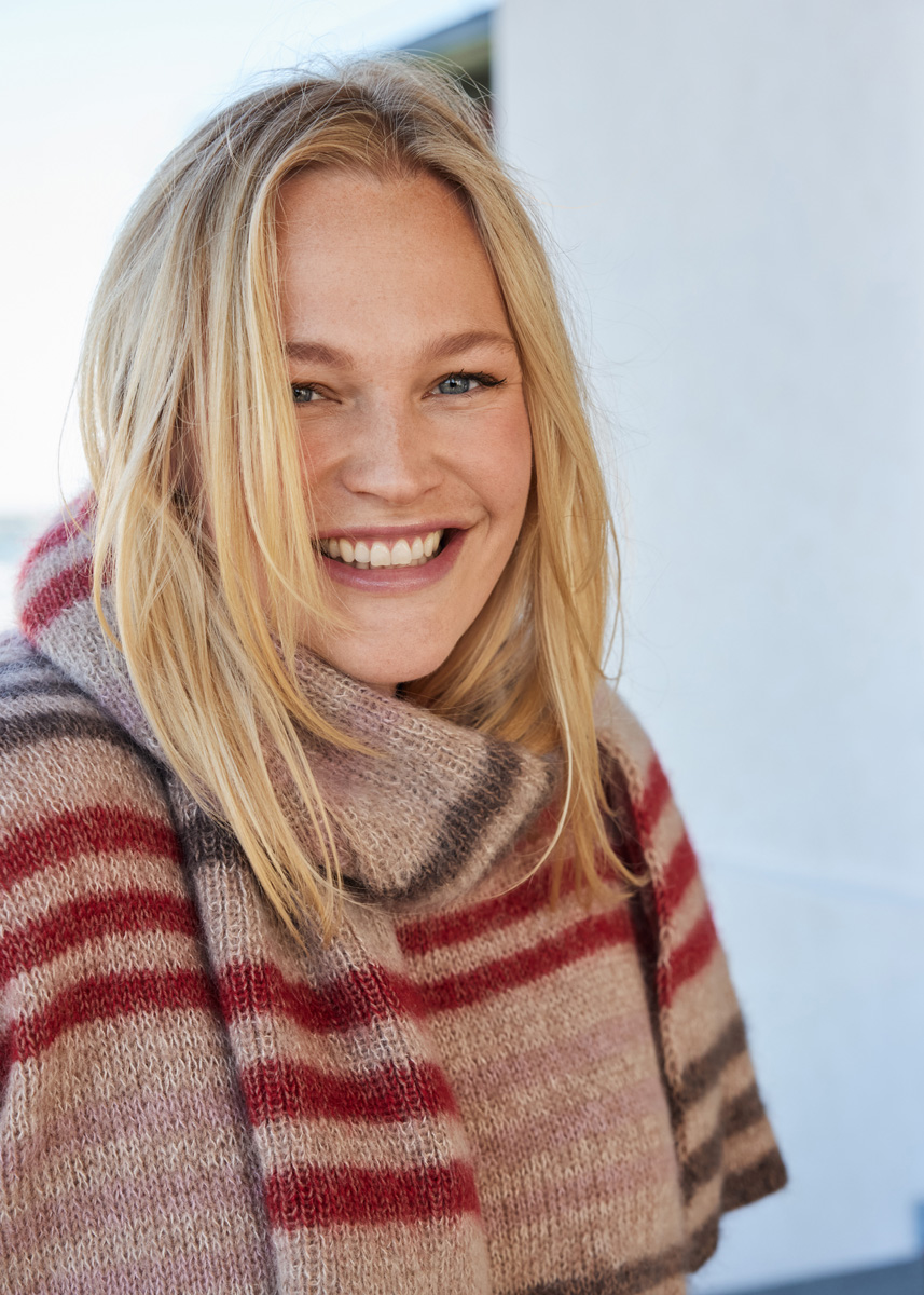 Lana Grossa Cool Wool Lace (100% laine vierge (mérinos extrafine), long. de fil 400 m/50 g), 100 g en nougat (col. 41), Lana Grossa Silkhair (70% mohair (superkid), 30% soie, long. de fil 210 m/25 g), 50 g en beige clair (col. 18), 25 g en anthracite (col. 183), rouge lie de vin (col. 208) et lilas pâle (col. 87). Aig. à tric. n° 4.