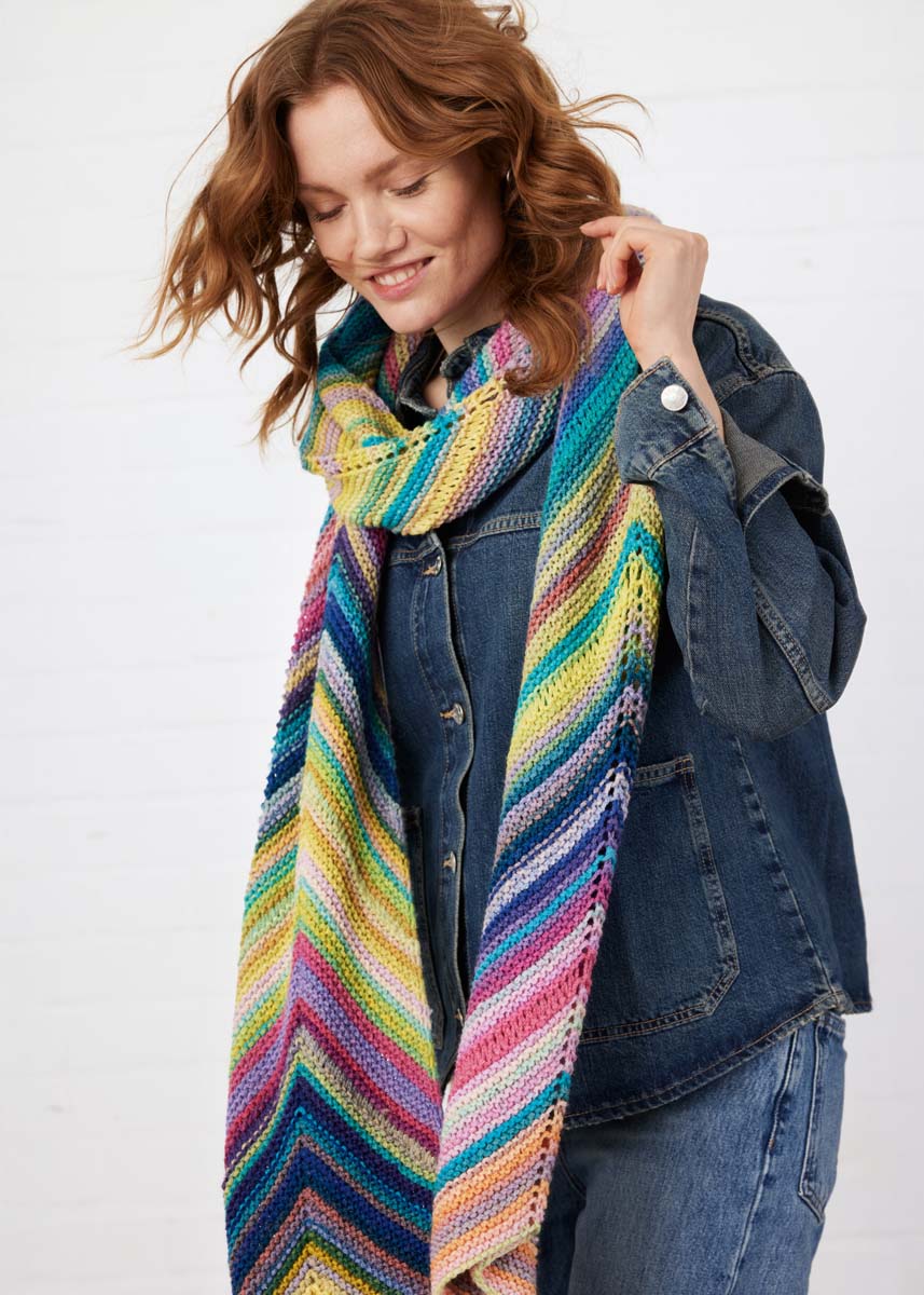 Lana Grossa «Farfalla» (94% laine vierge mérinos extra fine, 6% polyamide, long. de fil = 340 m/100 g), 400 g en turquoise/jaune citron/rose vif/violet/lilas/vieux rose/ gris vert/gris pâle/gris foncé/orange (col. 7) ; aig. circ. n° 6,5.