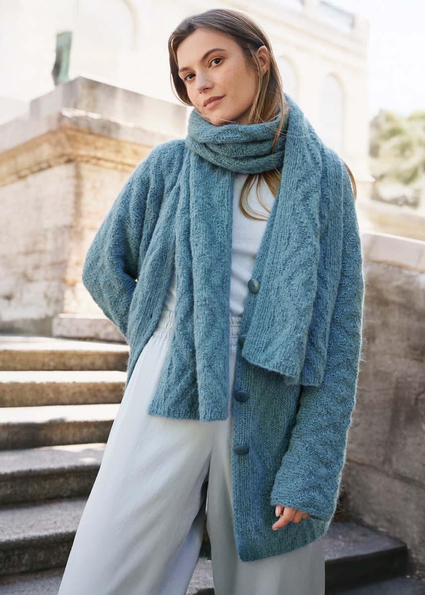 Lana Grossa qualité Nebbia (55 % laine vierge (mérinos extra-fin), 45 % alpaga (bébé), longueur du fil 170 m/50 g) : 200 g en bleu pigeon (col. 5) ; aiguilles à tricoter n° 5
