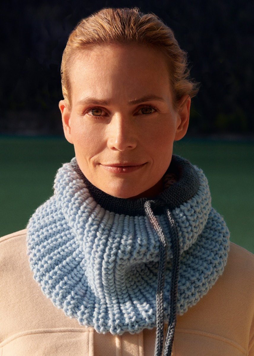 Lana Grossa Superbingo (100% laine vierge, long. de fil = 55 m/50 g), 200 g en bleu clair (col. 69) et Lana Grossa Cool Wool Big (100% laine vierge, long. de fil 120 m/50 g), 50 g en bleu acier (col. 981) ; aig. circ. n° 4 et 6 de 40 cm de long., 2 aig. d´un jeu d´aig. n° 4