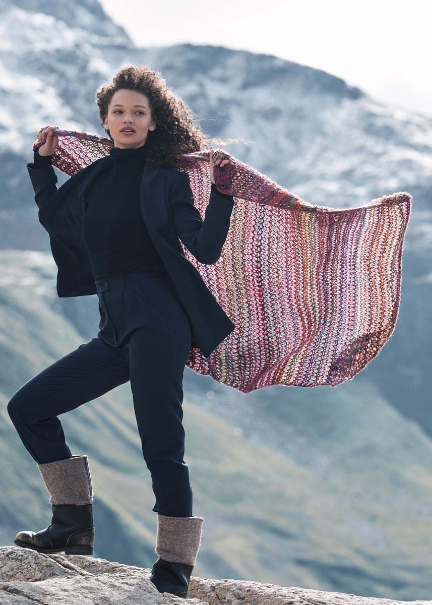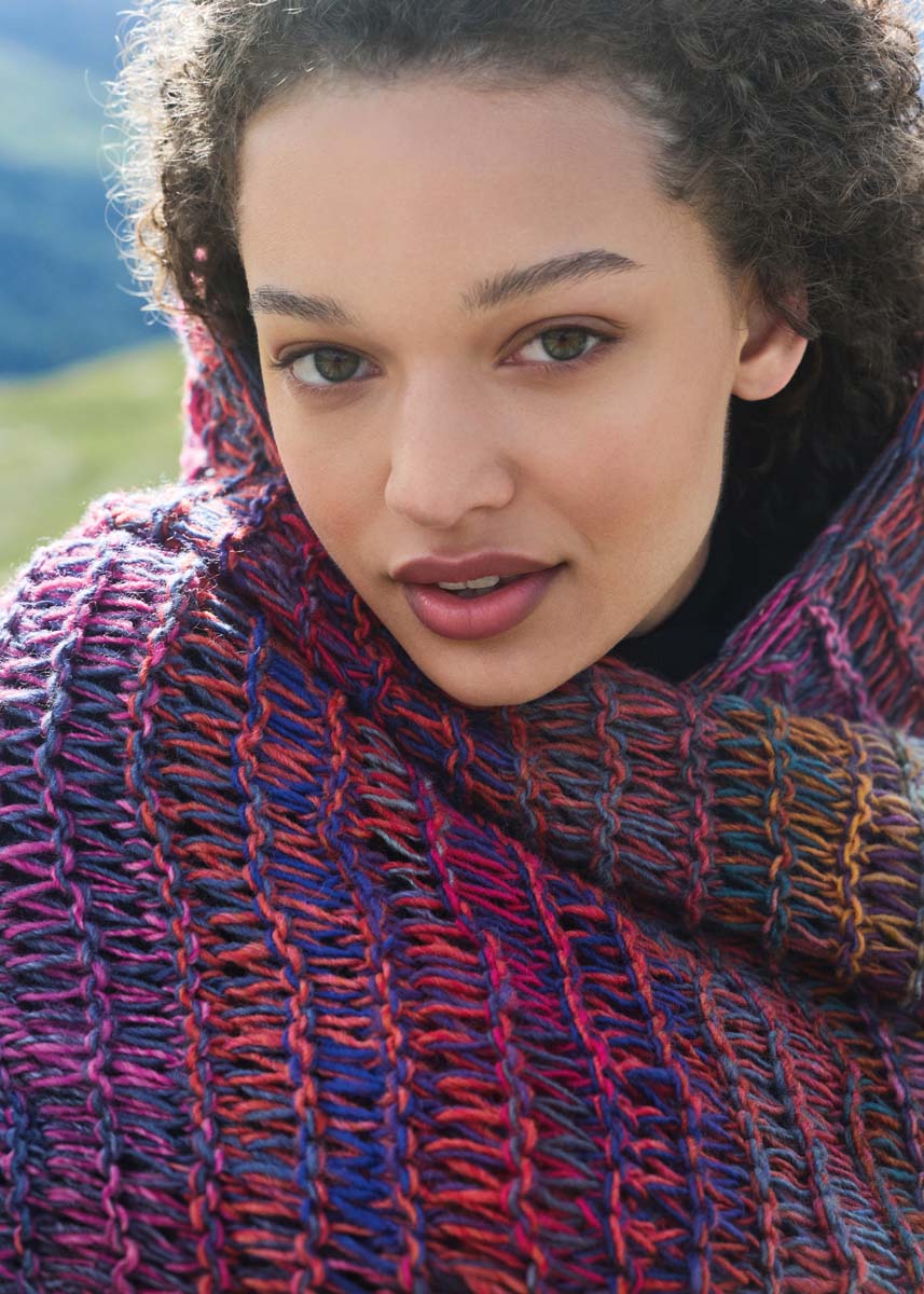 Lana Grossa qualité «Gomitolo Intenso» (50% laine vierge, 50% polyacrylique, long. de fil = env. 700 m/200 g) : 1 pelote = env. 200 g en gris foncé/bleu foncé/ gris bleu/pétrole/bois de rose/bleu violet/gris vert (col. 231) et 1 pelote = env. 200 g rose vif/ lilas/jaune ocre/jaune doré/ fraise/terre cuite (col. 238) ; aig. à tric. n° 9.