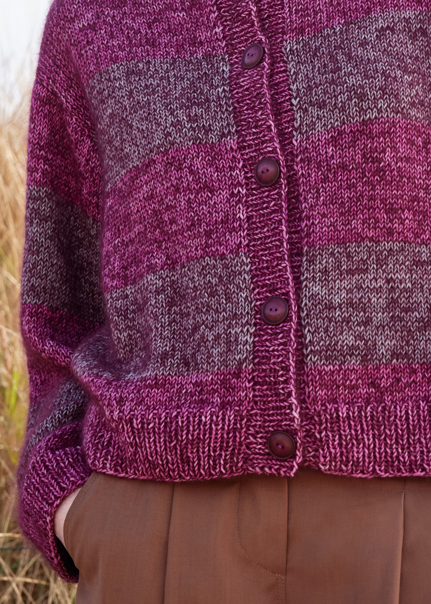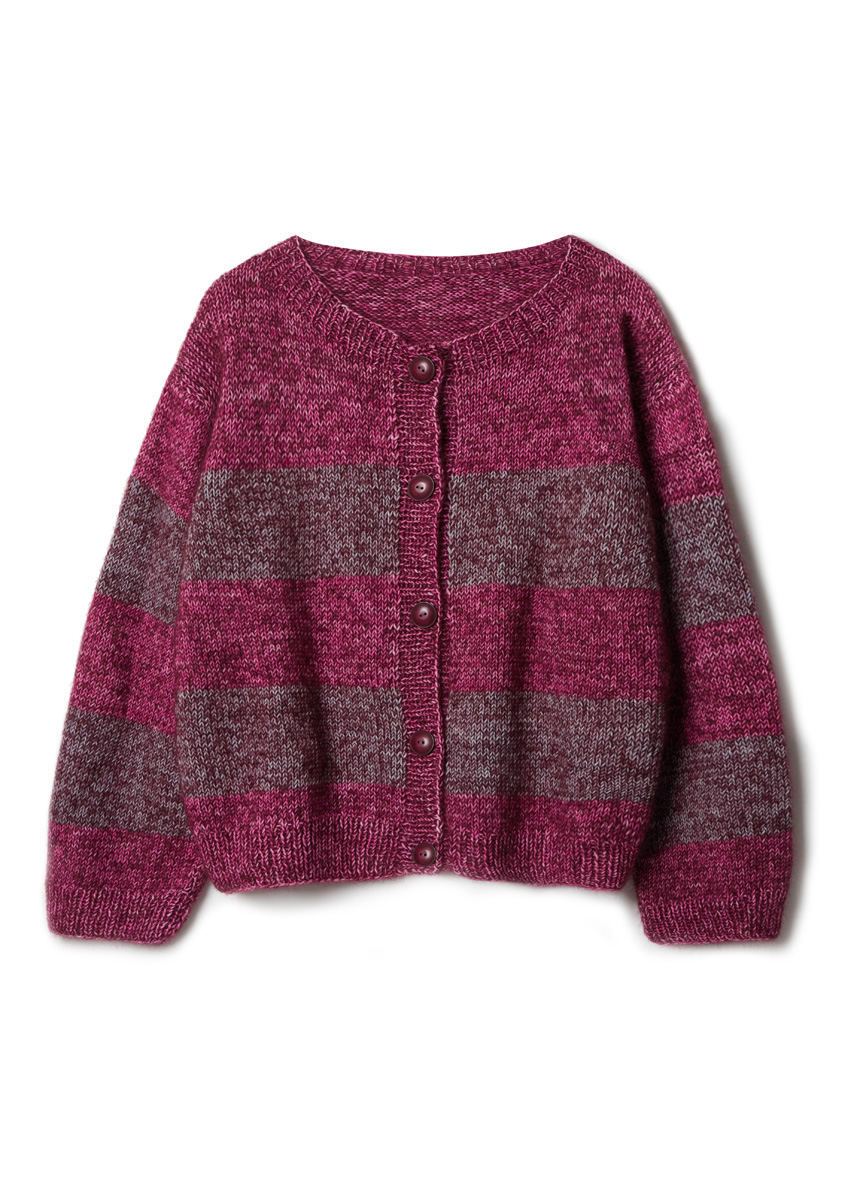 Lana Grossa Cool Wool Vintage (100% laine vierge (mérinos extrafine), long. de fil 160 m/50 g), 200 (250 - 300 - 300) g en rose vif (col. 7389) et 150 (200 - 250 - 250) g en gris clair (col. 7369), Lana Grossa Silkhair (70% mohair (superkid), 30% soie, long. de fil 210 m/25 g), 150 (175 - 200 - 225) g en rouge foncé (col. 177). Aig. à tric. n° 4,5 et 5. 5 boutons Ø 25 mm