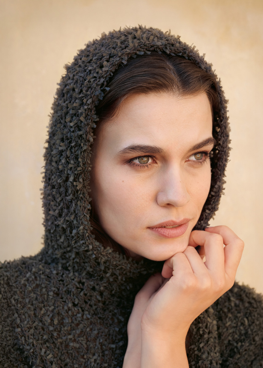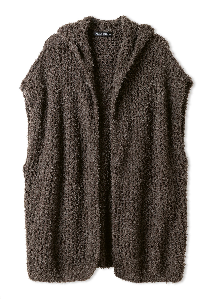 Lana Grossa qualité Frizzante (54 % coton, 46 % polyamide, long. de fil = env. 105 m/50 g) : 400 (450 - 500 - 550) g en mocca (col. 4) ; aig. à tric. n° 5.