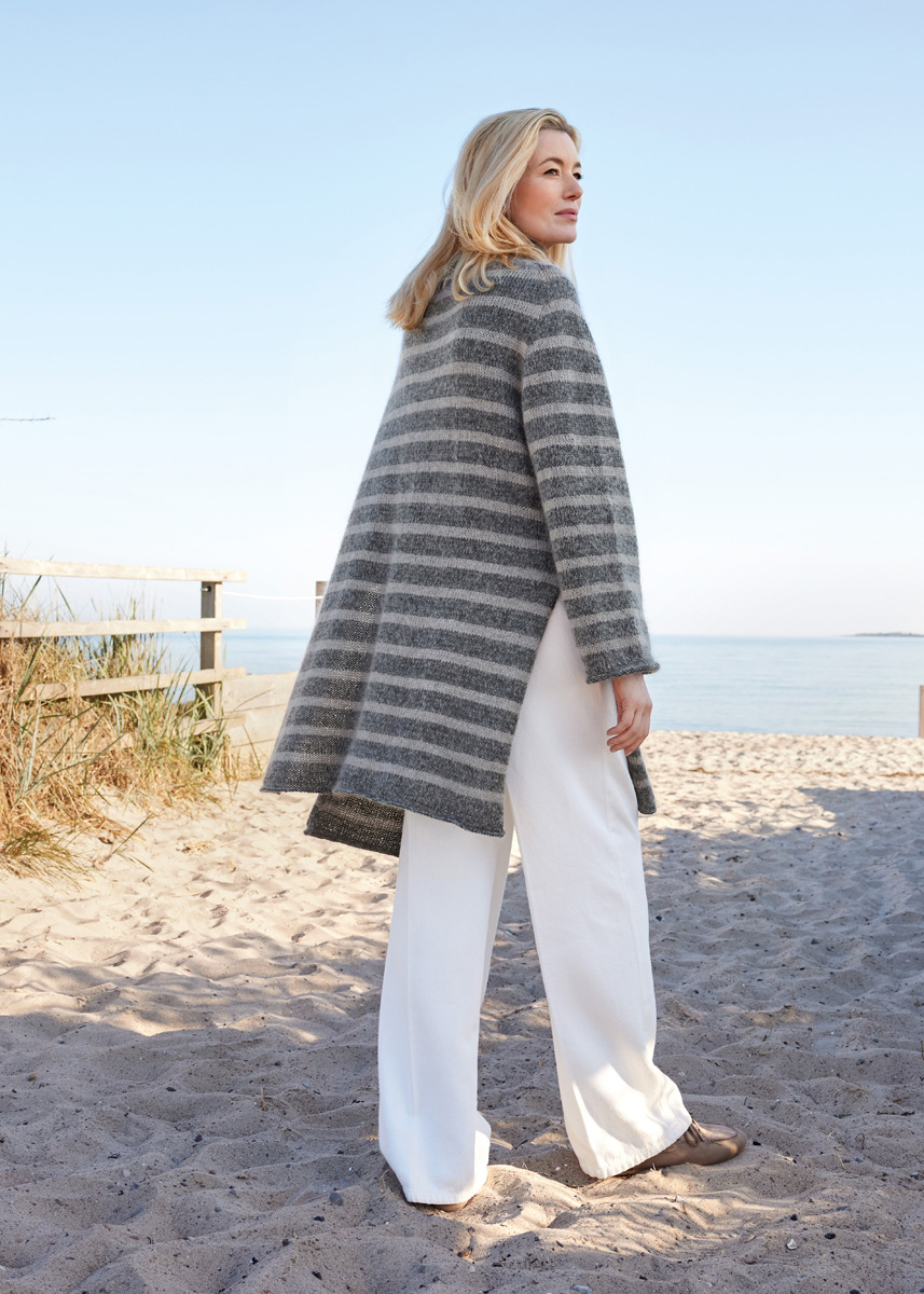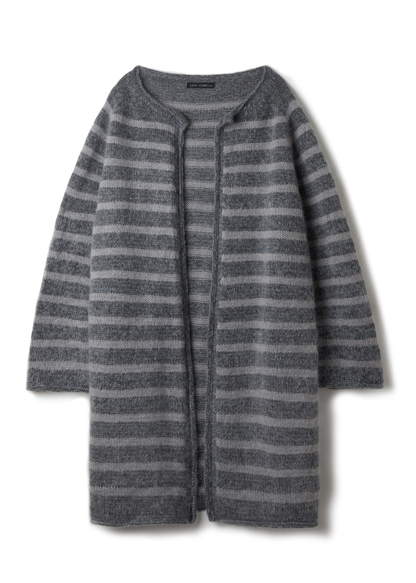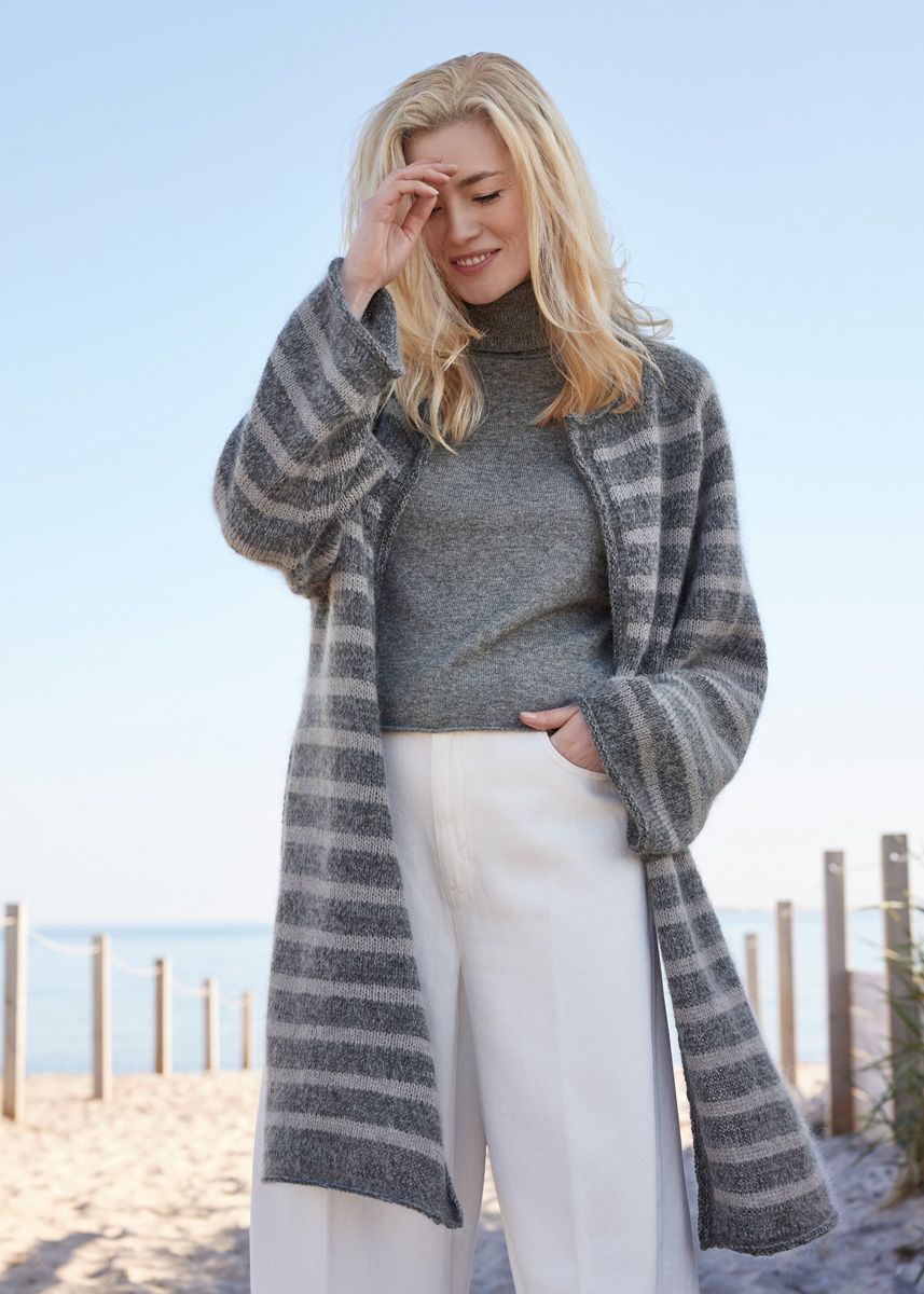 Lana Grossa Merino Superiore (100% laine vierge (mérinos extrafine), long. de fil 180 m/50 g), 350 (400 - 450) g en gris foncé (col. 06) et 150 (200 - 250) g en gris clair (col. 05), Lana Grossa Silkhair (70% mohair (superkid), 30% soie, long. de fil 210 m/25 g), 125 (150 - 175) g en gris graphique (col. 94) et 50 (75 - 75) g en gris beige (col. 184). Aig. circ. n° 5 de 80 cm de long et une de 100 ou 120 cm de long ainsi que 5 aig. d´un jeu d´aig. ou une aig. circ. n° 4 de 40 cm de long ; aig. circ. n° 4,5 de 80 cm de long et une de 100 ou 120 cm de long. 2 aig. aux. pour mettre les m. en attente, 4 AM.