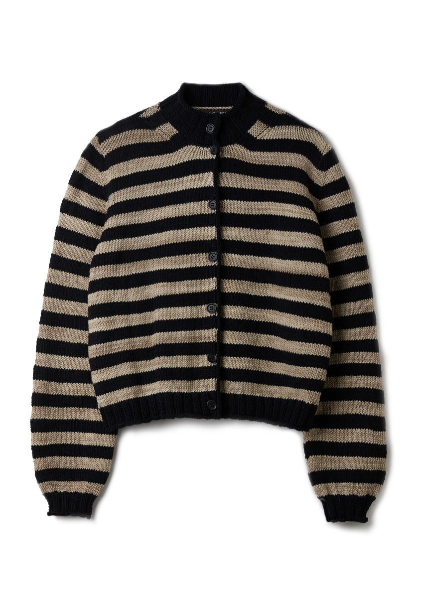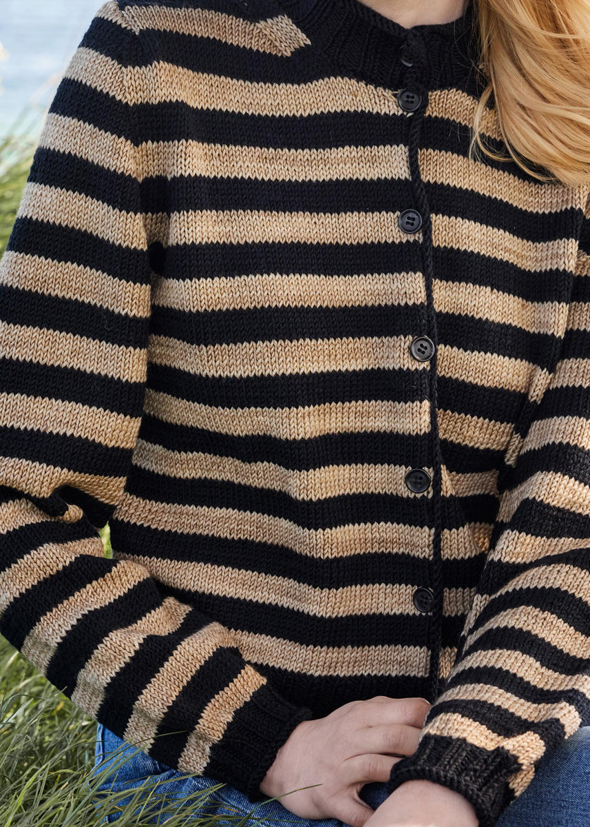 Lana Grossa Cool Wool Big (100% laine vierge (mérinos extrafine), long. de fil 120 m/50 g), 300 (350 - 350) g en noir (col. 627), Lana Grossa Cool Wool Big Vintage (100% laine vierge (mérinos extrafine), long. de fil 120 m/50 g), 200 (250 - 300) g en beige sablé (col. 7182). Aig. circ. n° 3,5 et 4 de 60 ou de 80 cm de long. 2 AM. 7 boutons Ø 16 mm.