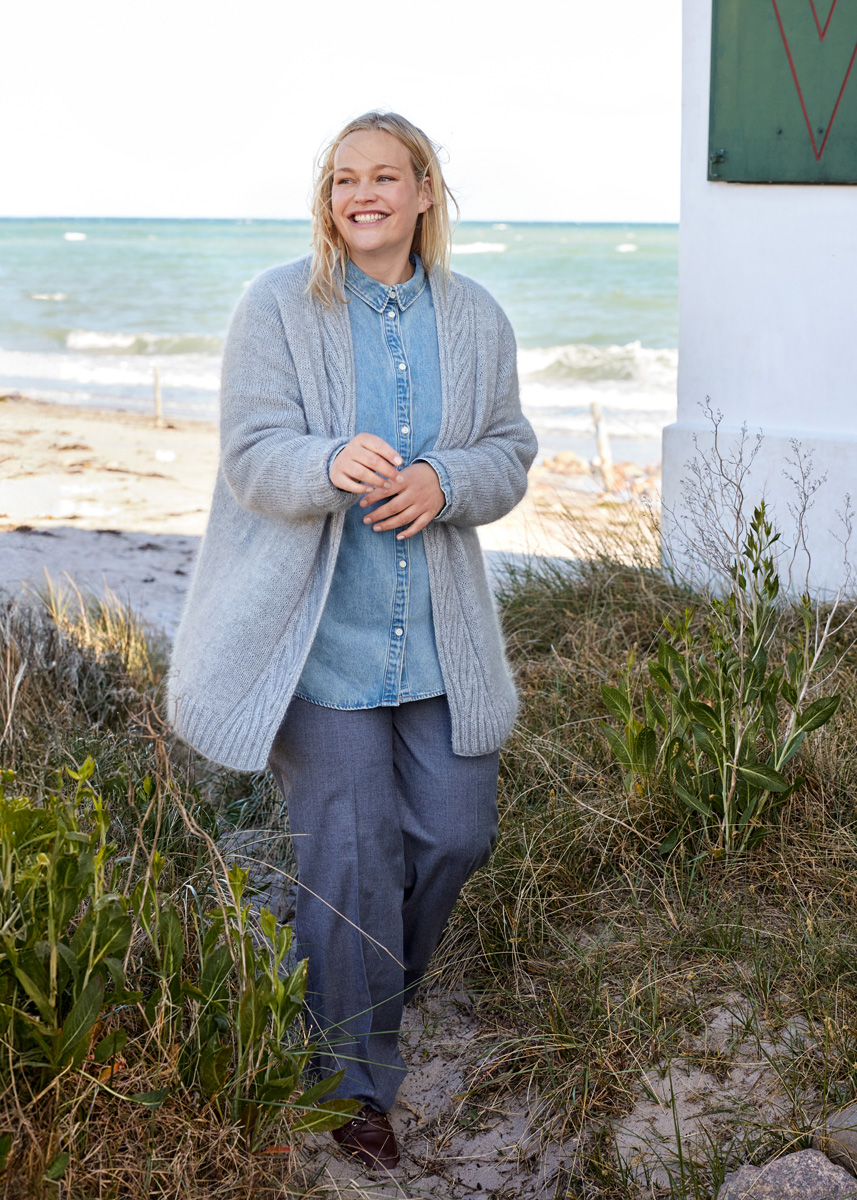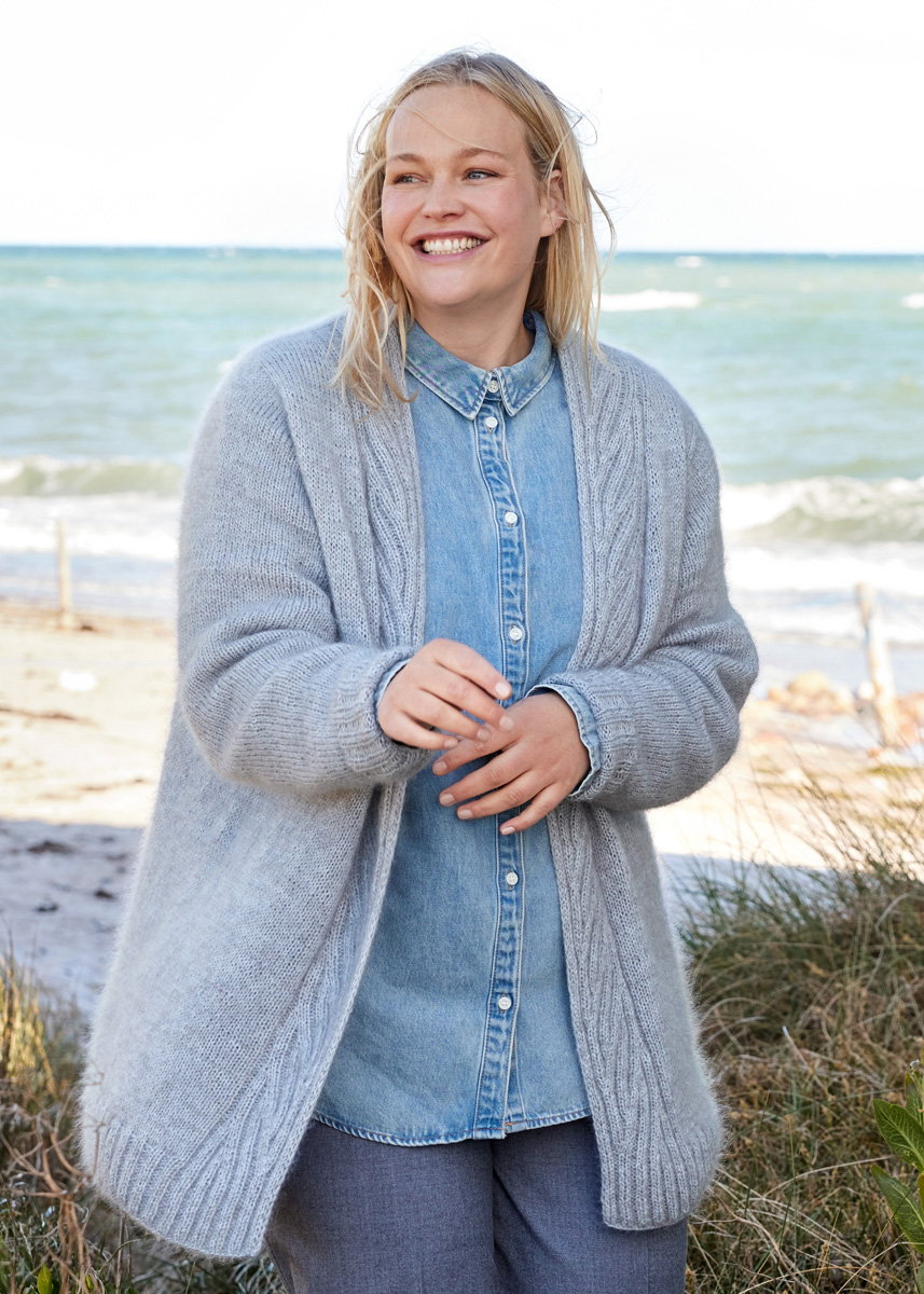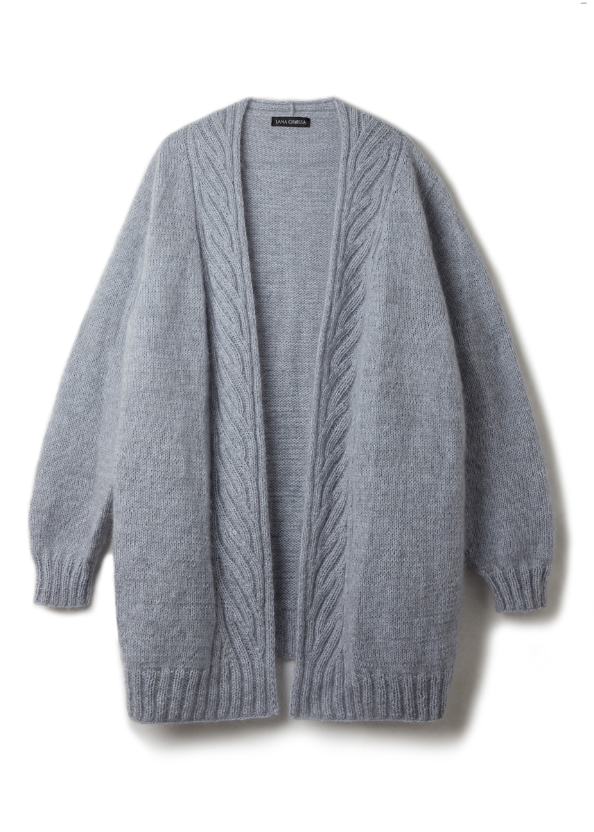 Lana Grossa Cool Wool Lace (100% laine vierge (mérinos extrafine), long. de fil 400 m/50 g), 400 (450 - 450 - 500) g en bleu pastel (col. 62). Lana Grossa Silkhair (70% mohair (superkid), 30% soie, long. de fil 210 m/25 g), 200 (200 - 225 - 250) g en gris graphite (col. 94). Aig. circ. n° 3,5 de 80 et de 120 cm de long. jeu d´aig. n° 3,5. aig. circ. n° 4 de 40 cm, une de 80 cm de long et une de 120 cm de long. 6 AM ; 3 aig. aux. pour mettre les m. en attente.