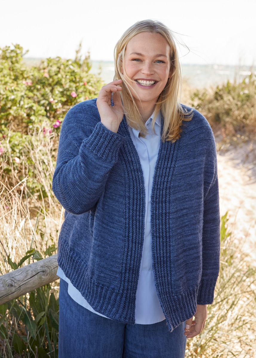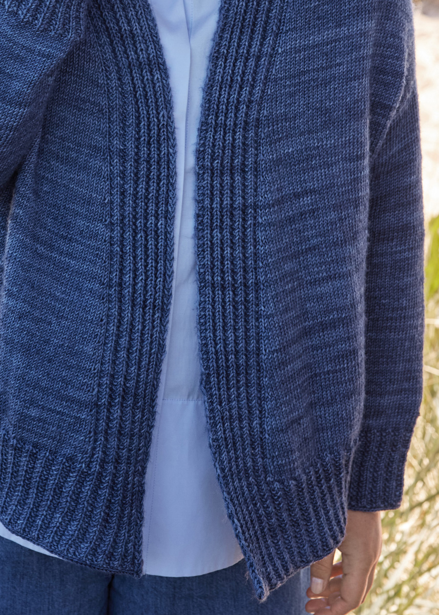 Lana Grossa Cool Wool Vintage (100% laine vierge (mérinos extrafine), long. de fil 160 m/50 g), 500 (550 - 600) g en bleu foncé (col. 7366). Aig. circ. n° 3,5 de 60, de 80 cm (ou aig. à tric. de 80 cm de long) et de 120 cm de long ; cinq aig. d´un jeu d´aig. n° 3,5, une aig. aux. pour mettre les m. en attente, 1 AM, 4 aig. aux. pour mettre les m. en attente.