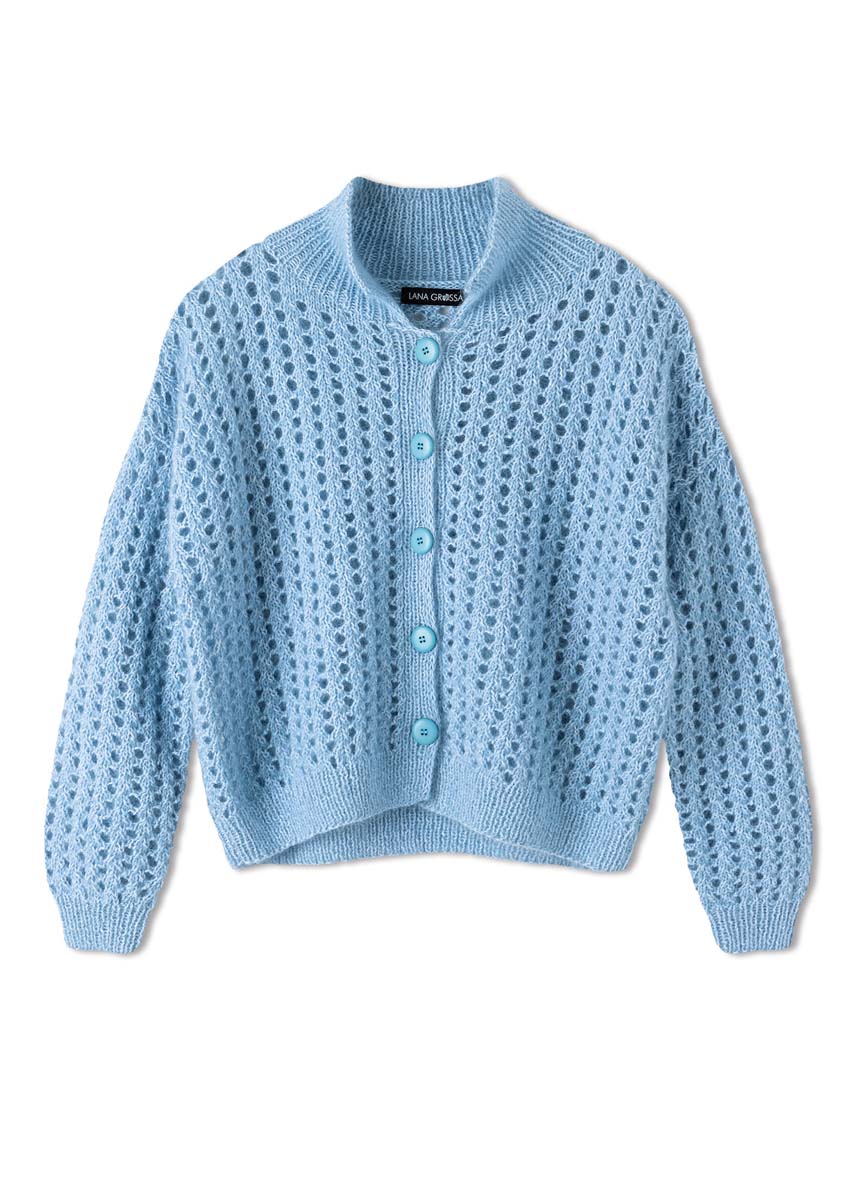 Lana Grossa qualité «Ecopuno» (72 % coton, 17 % laine vierge (mérinos), 11 % (baby) alpaga, long. de fil = env. 215 m/50 g) : env. 300 (300 - 350) g en bleu pastel (col. 207) et Lana Grossa qualité «Silkhair» (70% mohair (superkid), 30% soie, long. de fil = env. 210 m/25 g) : env. 125 (125 - 150) g en bleu pâle (col. 201) ; aig. à tric. n° 3,5 et 4, aig. circ. n° 3,5 de 80 cm de long ; 5 boutons bleu turquoise, 25 mm de diamètre.
