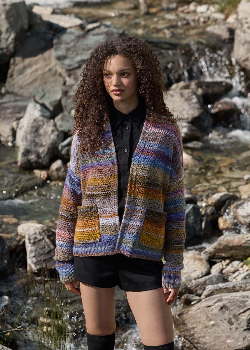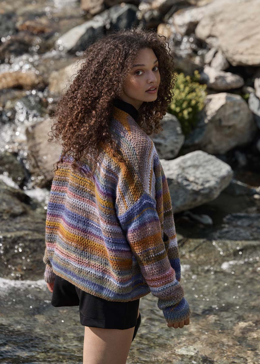 Lana Grossa qualité «Gomitolo Intenso» (50% laine vierge, 50% polyacrylique, long. de fil = env. 700 m/200 g) : 2 (2 - 3 - 3) pelotes = env. 400 (400 - 600 - 600) g en jaune d´oeuf/jaune moutarde/coquille d´oeuf/gris beige/ violet/jean/gris clair/gris (col. 235) ; aig. à tric. n° 3,5 et 4,5.