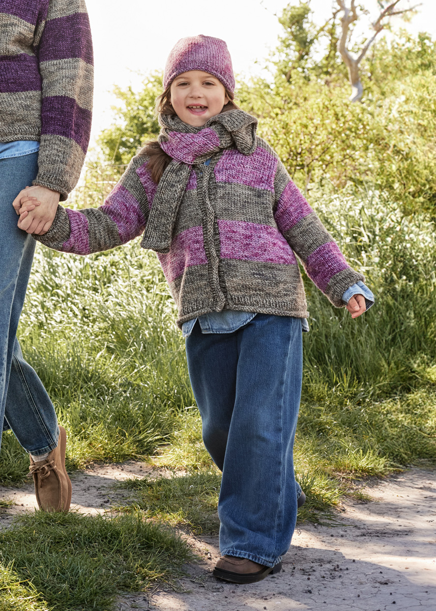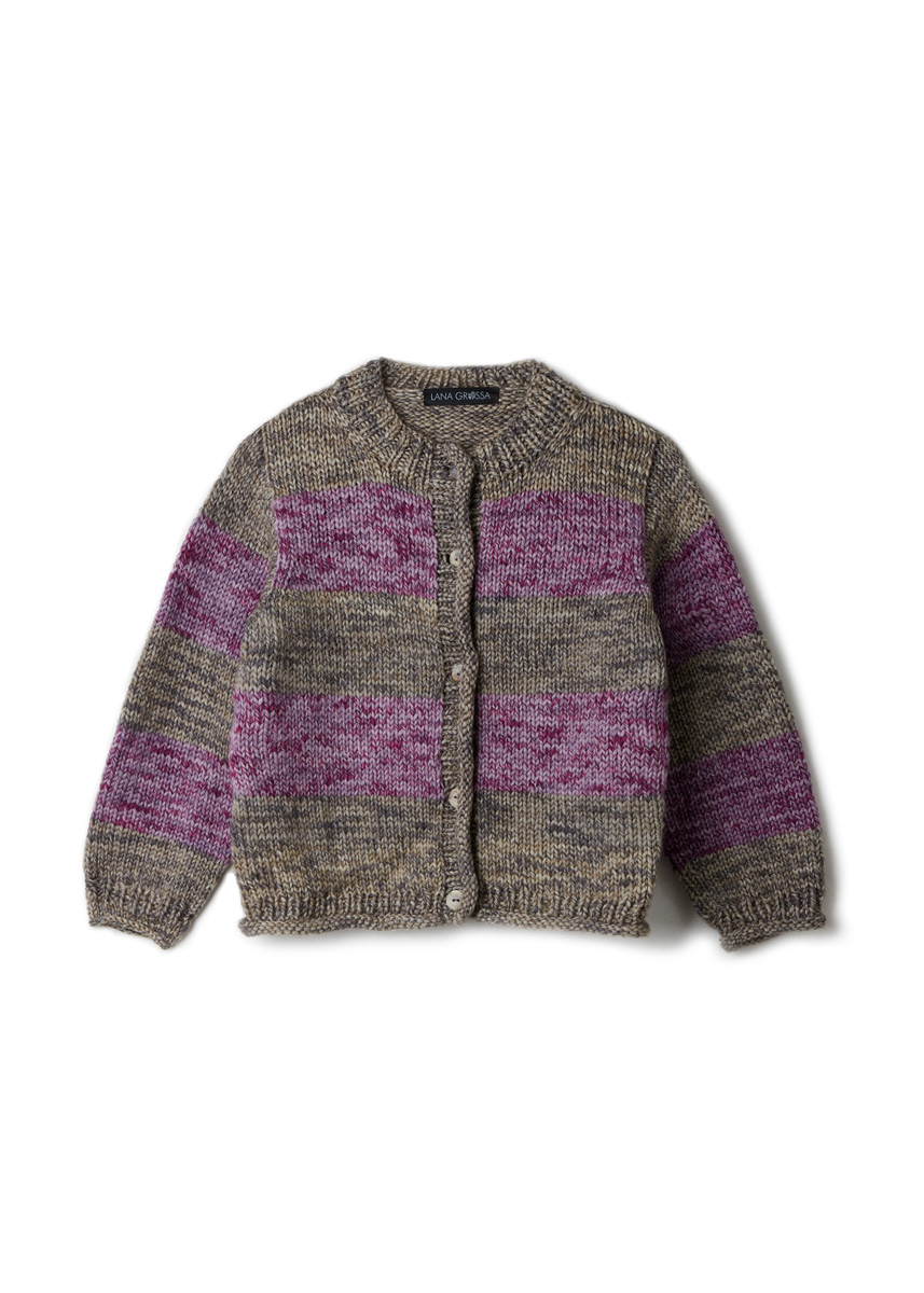 Lana Grossa Vintage Superchunky (100% laine vierge (mérinos extrafine), long. de fil 80 m/50 g), 250 (250 - 300) g en beige/kaki (col. 1) et 150 (200 - 250) g en gris beige/ mauve (col. 07). Aig. circ. de 80 cm de long. et jeu d´aig. (5 aig.) n° 5 et 6. 2 aig. aux. pour mettre les m. en attente, 2 AM. 5 boutons Ø 18 mm.