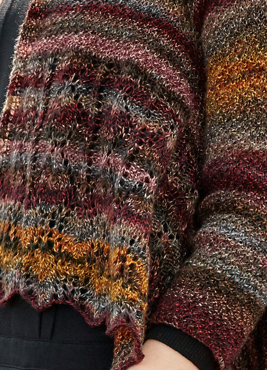 qualité de laine Lana Grossa «Gioia» (50% laine vierge, 50% polyacrylique, long. de fil 380 m/100g) 400 (500 – 600) g en doré/brun/noir/argent/rose/bordeaux(col. 103) ; aig. à tric. n° 4,5 ; jeu d´aig. n° 4,5