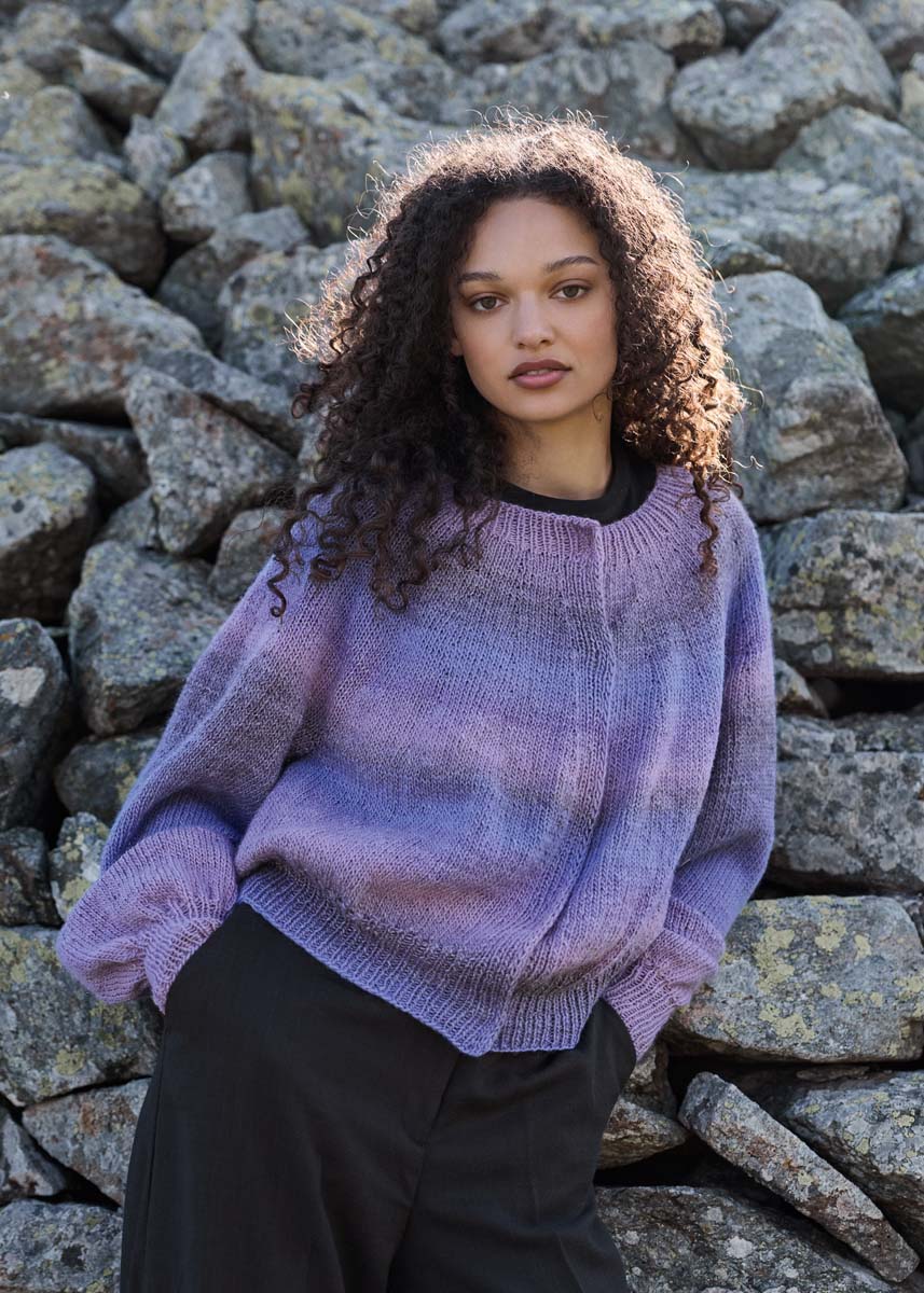 Lana Grossa qualité «Gomitolo Gala» (60% laine vierge, 38% polyacrylique, 2% polyester, long. de fil = ca. 700 m/200 g) : 2 (2 - 2 - 3) pelotes = env. 400 (400 - 400 - 600) g en lilas/mauve/gris lilas/bleu lilas/violette (col. 4027) ; aig. circ. courte et longue n° 4 et 4,5 ; jeu d´aig. n° 4 et 4,5. 5 boutons à pression d´env. 20 cm de diamètre.