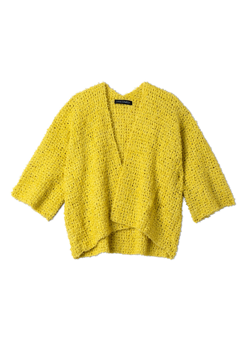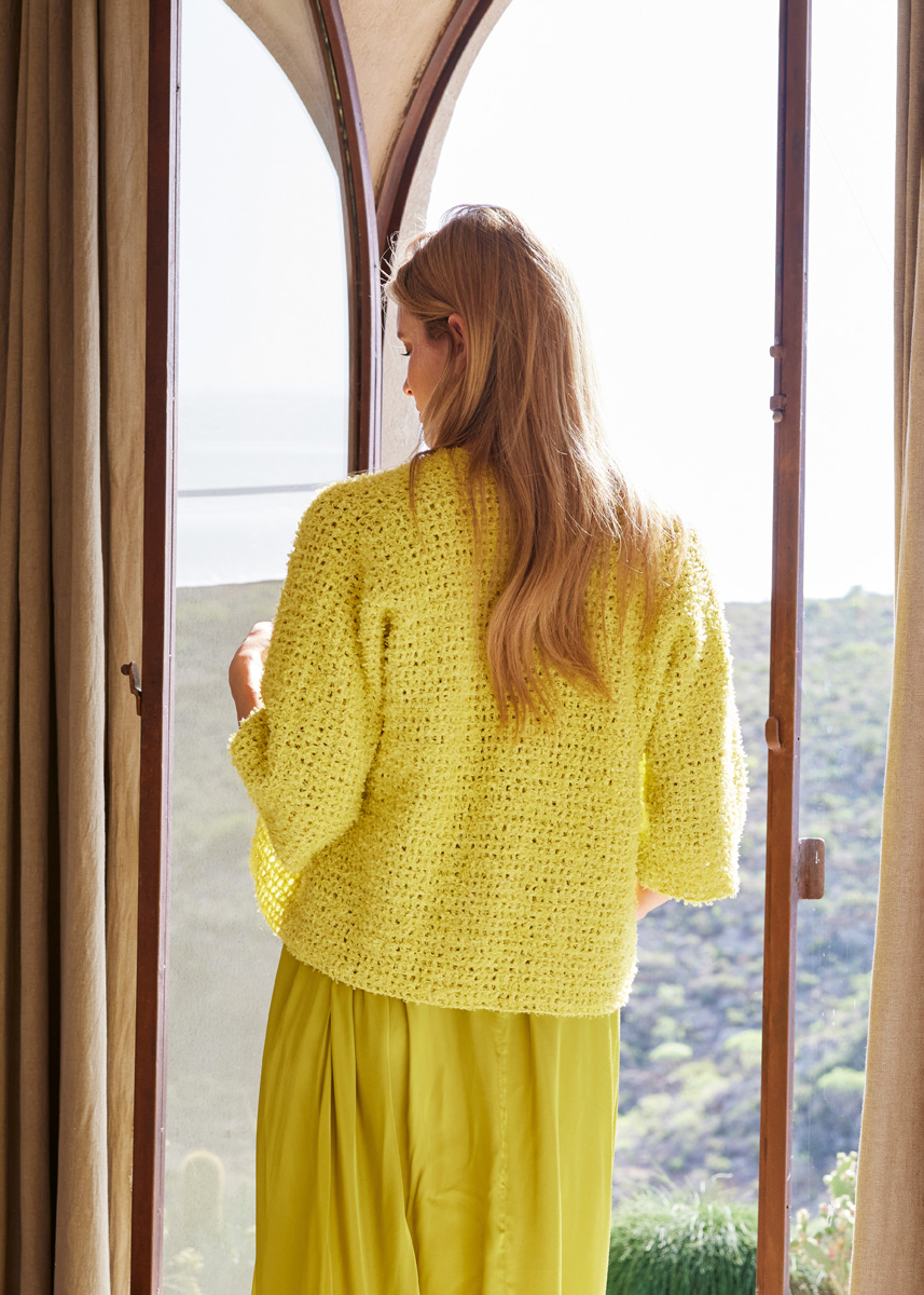 Lana Grossa Frizzante (54 % coton, 46 % polyamide, long. de fil = env. 105 m/50 g), 400 (450 - 500 - 550) g en jaune citron (col. 10). 1 crochet n° 3,5.