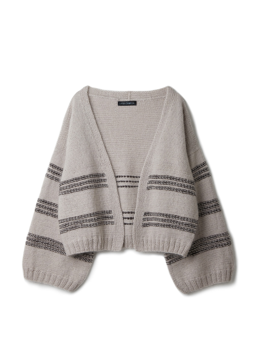 Lana Grossa Silkhair (70% mohair (superkid), 30% soie, long. de fil 210 m/25 g). 150 (175 - 200) g en beige clair (col. 18), Lana Grossa Merino Superiore (100% laine vierge (mérinos extrafine), long. de fil 180 m/50 g), 300 (350 - 400) g en grège (col. 4), Lana Grossa Cool Wool (100% laine vierge (mérinos extrafine), long. de fil = env. 160 m/50 g), 50 (50 - 100) g en brun noir (col. 2113). une aig. circ. n° 4 de 80 cm de long ; 2 aig. aux. pour mettre les m. en attente