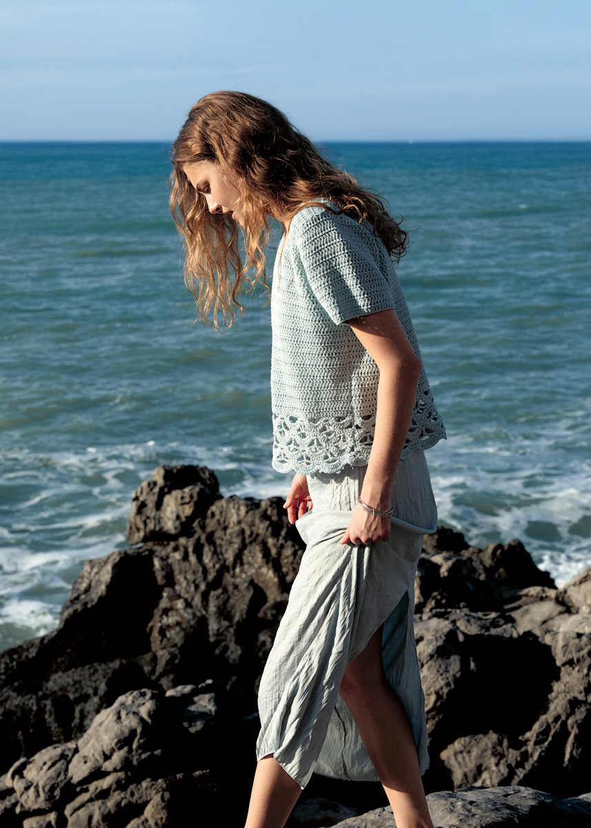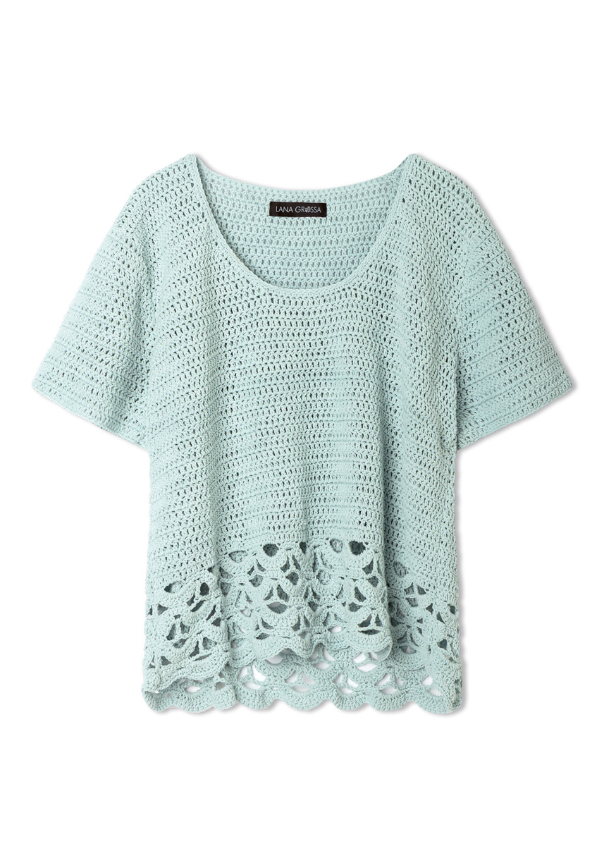 Lana Grossa « Gioia » (75 % coton, 25 % polyamide rec., long. de fil = env. 110 m/50 g) : env. 450 (500) g menthe (col. 13) ; 1 crochet n° 4,5.