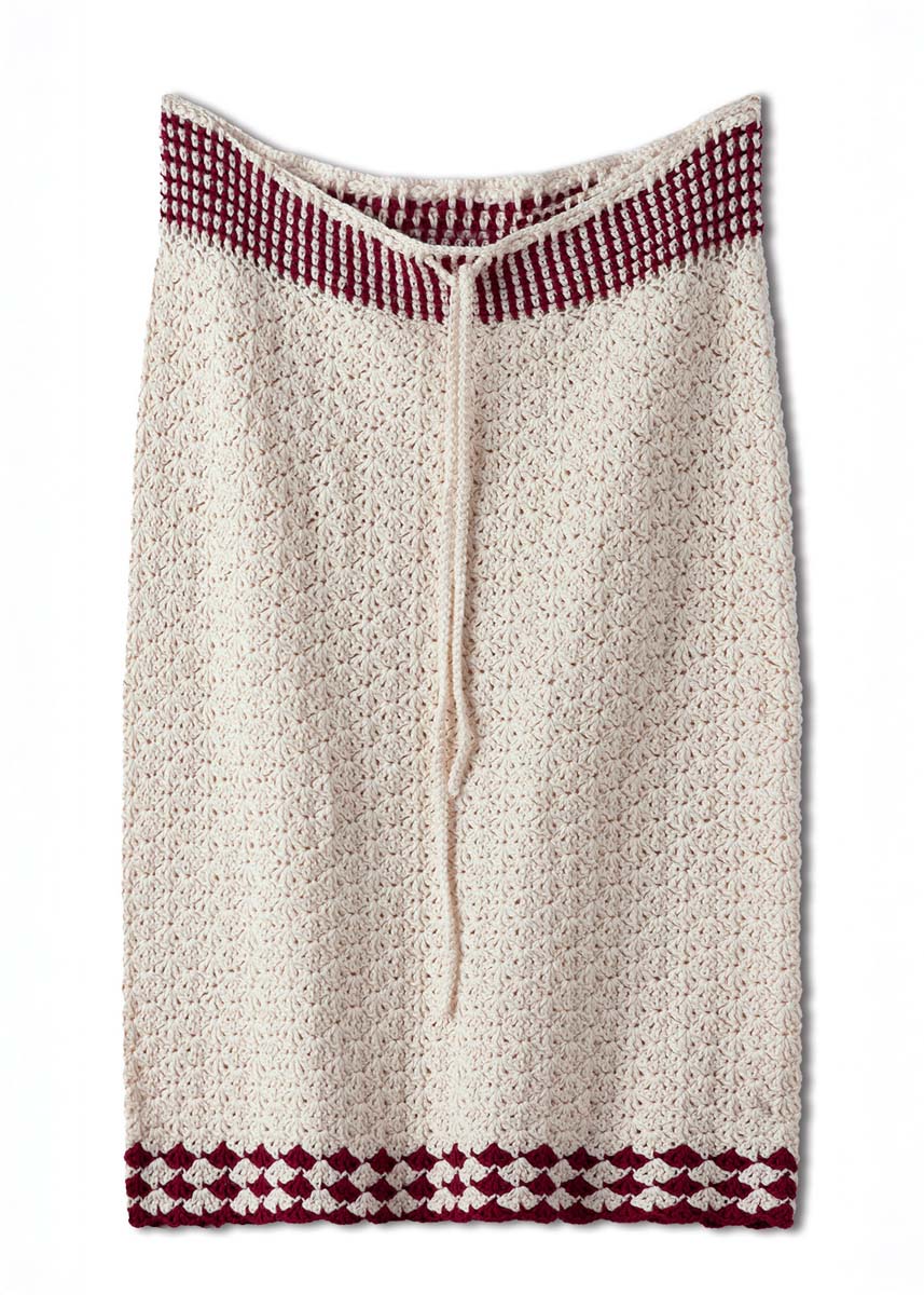 Lana Grossa qualité „Campo“ (65 % coton, 25 % viscose, 10 % lin, longueur de fil 125 m/50 g) : env. 300 (350) g crème (col. 2) et env. 50 g bourgogne (col. 26) ; 1 crochet à laine N° 3,5.