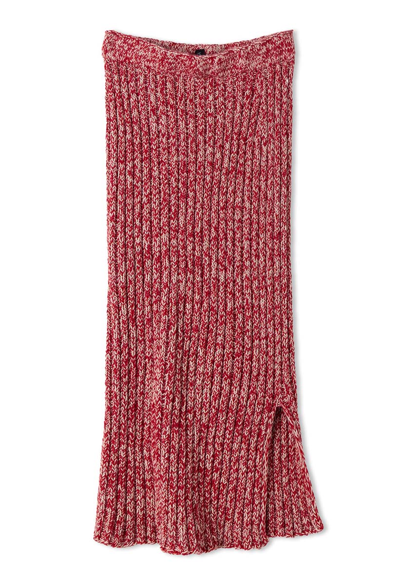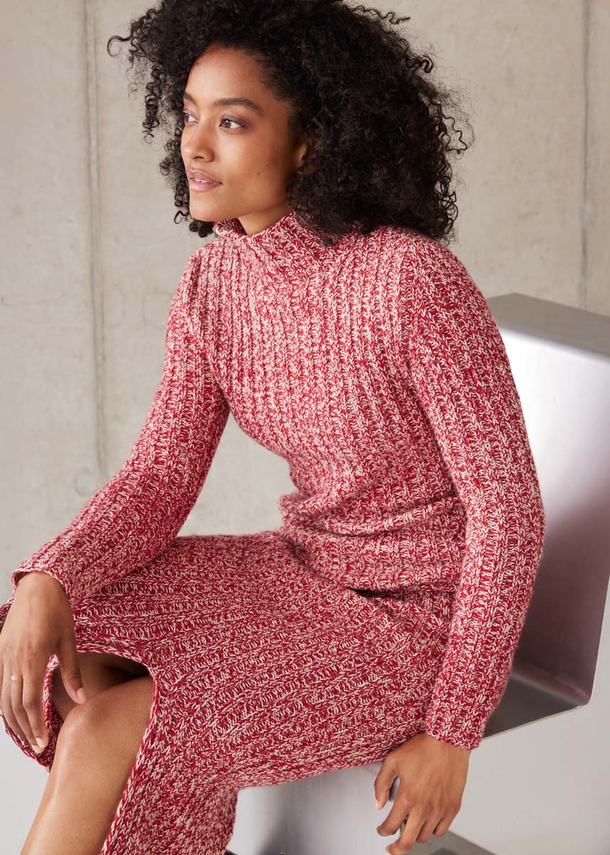 Lana Grossa qualité « Ecopuno » (72% coton, 17% laine vierge (mérinos), 11 % (bébé) alpaga, métrage 215 m/50 g), 250 (300 - 350) g en beige perle (col. 66) et 250 (300 - 350) g en rouge cerise (col. 47) ; une aiguille à tricoter circulaire de 80 cm de long, taille 4,5 ; 2 marqueurs de mailles ; environ 80 (86 -