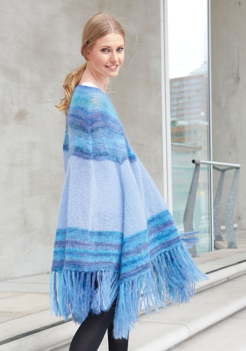 Lana Grossa « Silkhair » (70% mohair superkid, 30% soie, long. de fil = env. 210 m/25 g) en bleu clair (col. 92), 125 g et Lana Grossa « Silkhair Print » (70% mohair, 30% soie, long. de fil 400 m/50 g) : en turquoise chiné (col. 344), 300g, aig. circ. n° 4,5 et 8, resp. 60 cm, 80 cm et 100 cm, crochet n° 6.