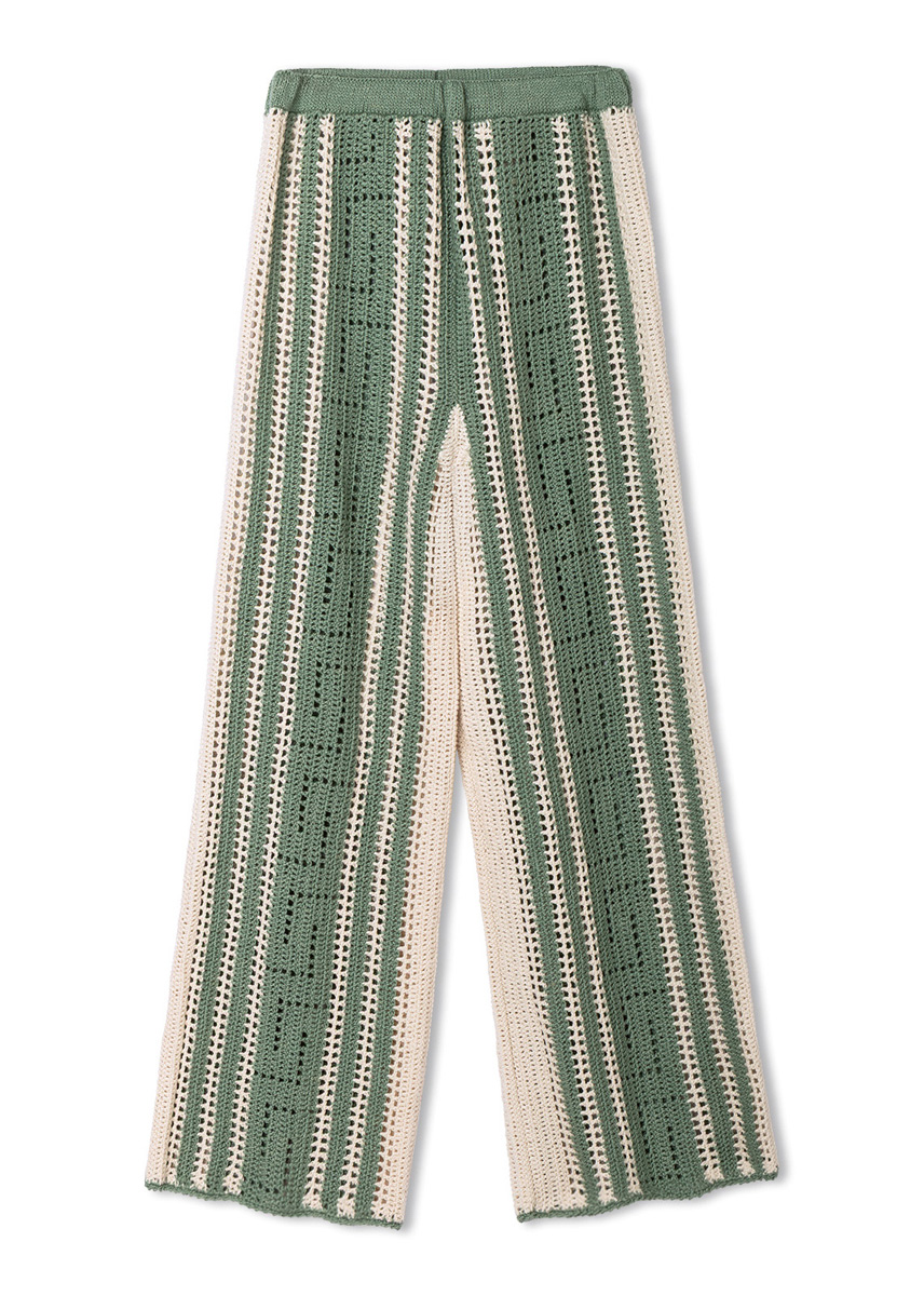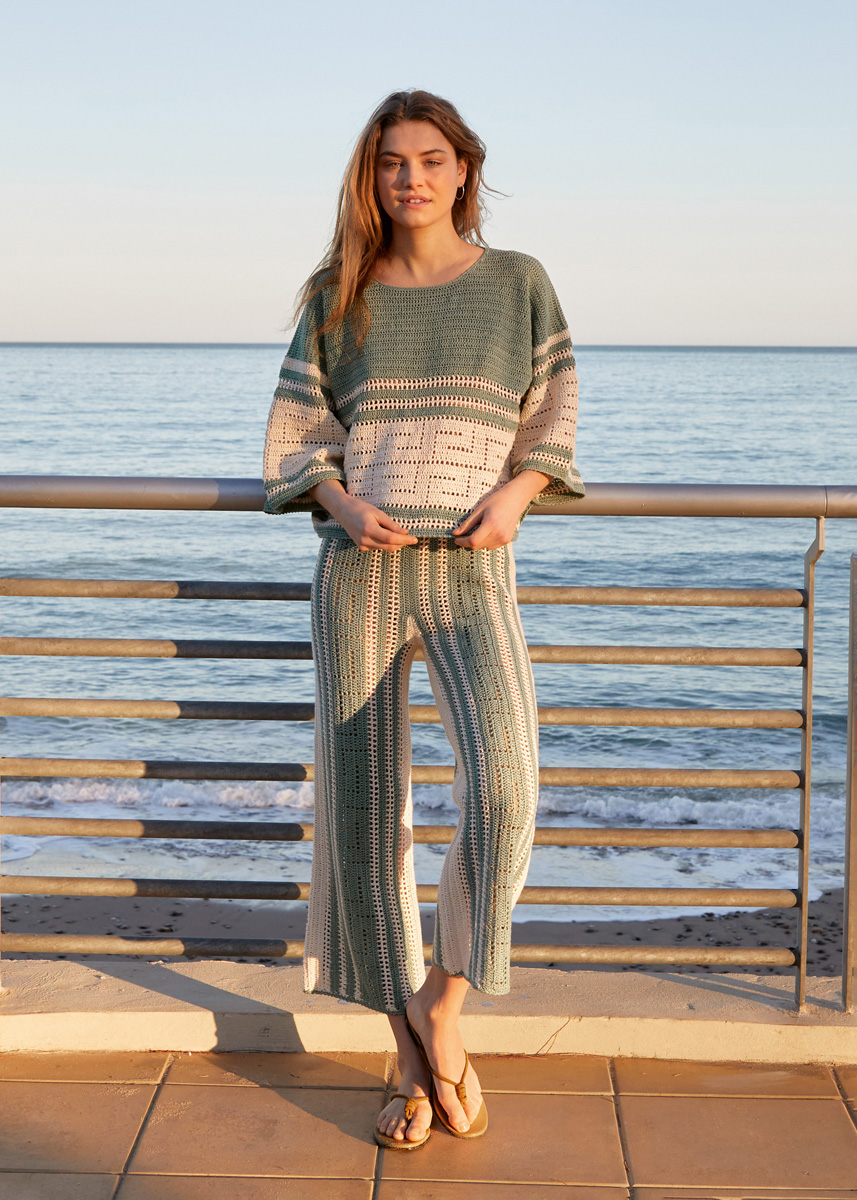 Lana Grossa « Summer Cashmere » (90 % coton, 10 % cachemire, long. de fil = env. 210 m/50 g) : env. 300 g crème (col. 2) et env. 200 g vert réséda (col. 23) ; 1 crochet n° 3 ; 1 aig. à tric. circ. n° 3, 60 cm de long, env. 65 cm de ruban élastique blanc, 2 cm de large.