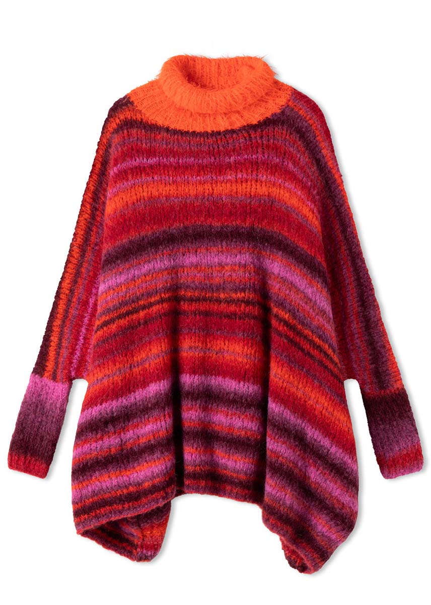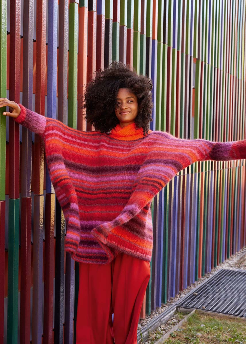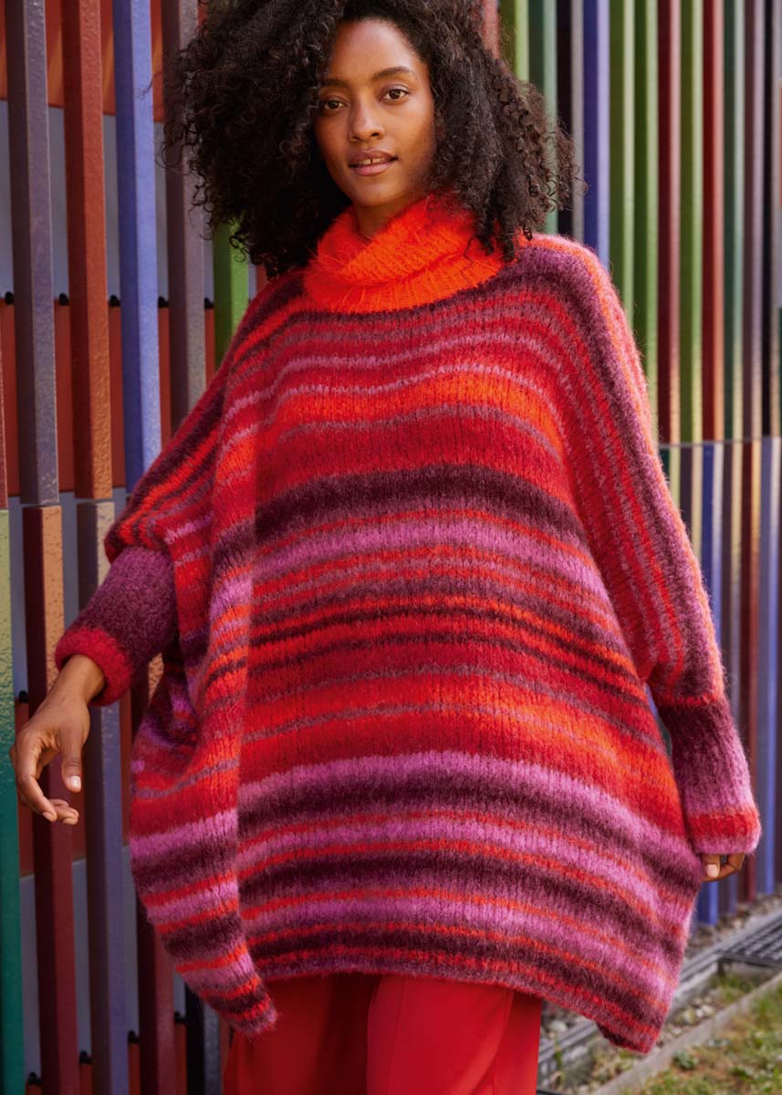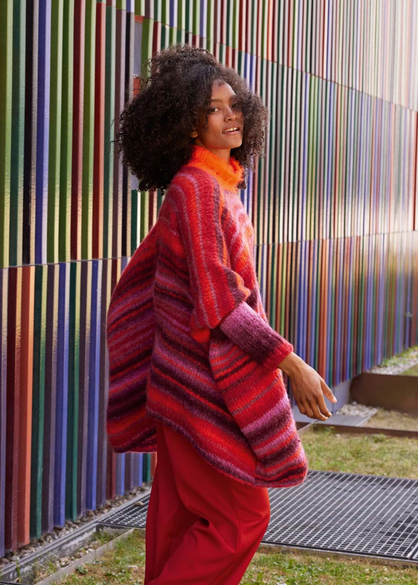 Lana Grossa qualité Gigante (70 % alpaga (fin), 30 % polyamide, LL = env. 300 m/100 g) : 400 (500) g en bordeaux/rouge paprika/prune/framboise (col. 17) et Lana Grossa qualité Basta (50 % laine vierge (mérinos), 50 % polyamide, LL = env. 100 m/50 g) : 50 g en orange (col. 11) ; aiguilles n° 7 et 8 ; une aiguille circulaire de 50 cm n° 7.
