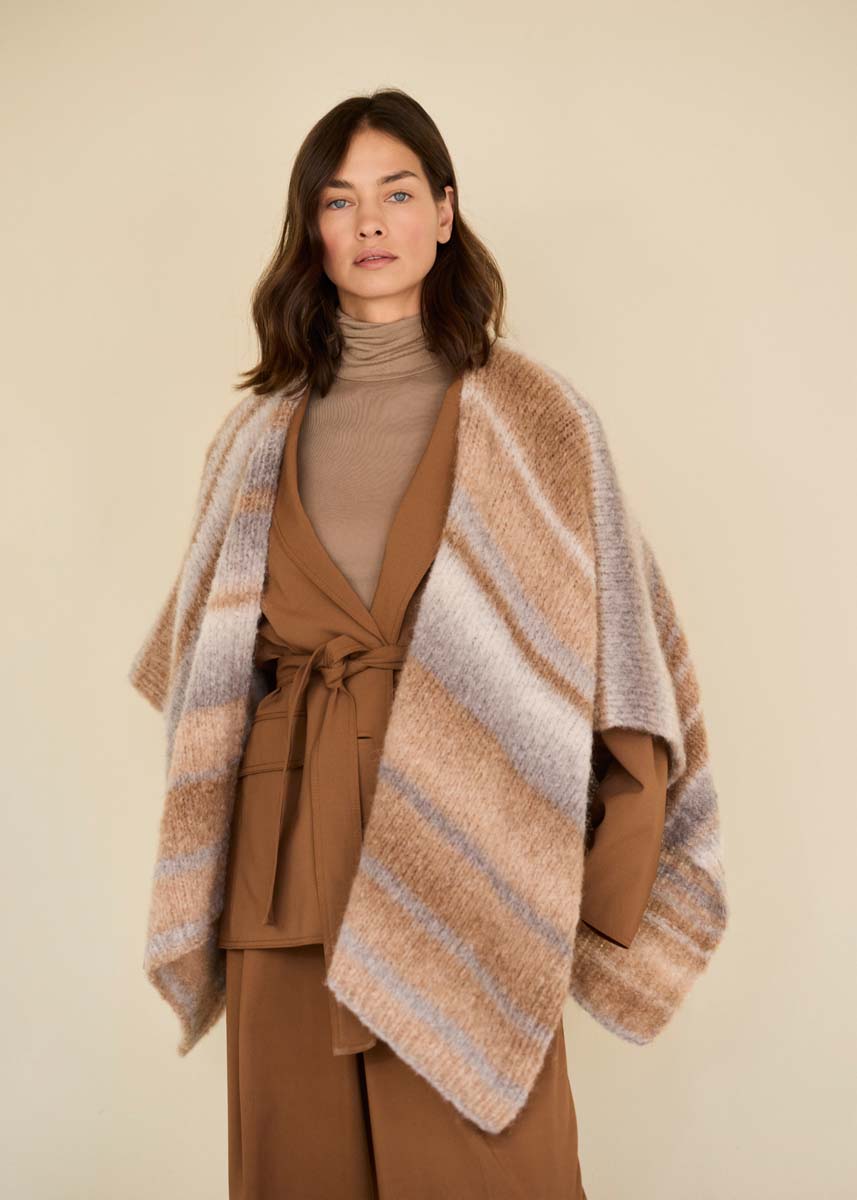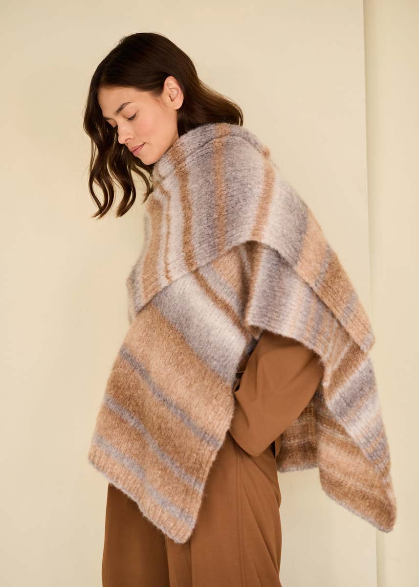 Lana Grossa qualité «Gigante» (70% alpaga (fine), 30% polyamide, long. de fil = env. 300m/100g) : env. 300 (300 -400 - 400) g en sable/beige clair/gris beige/ gris taupe (col. 20) ; aig. circ. courte et longue n° 6.