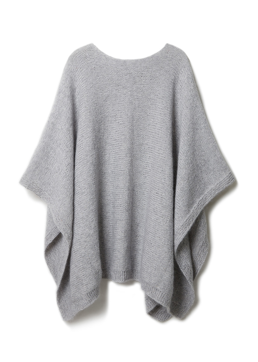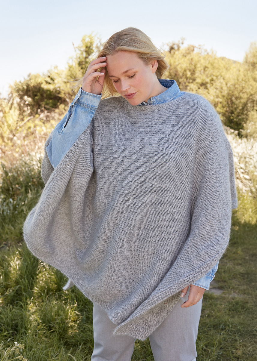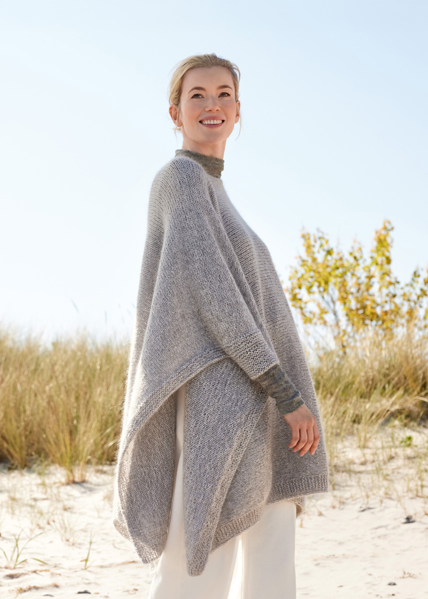 Lana Grossa Landlust Soft Tweed 180 (100% laine vierge (mérinos), long. de fil env. 180 m/50 g), 400 (500) g en gris argent chiné (col. 125), Lana Grossa Silkhair (70% mohair (superkid), 30% soie, long. de fil 210 m/25 g) 200 (250) g en gris graphite (col. 94). Aig. à tric. n° 6 ; 2 aig. aux. pour les m. en attente.